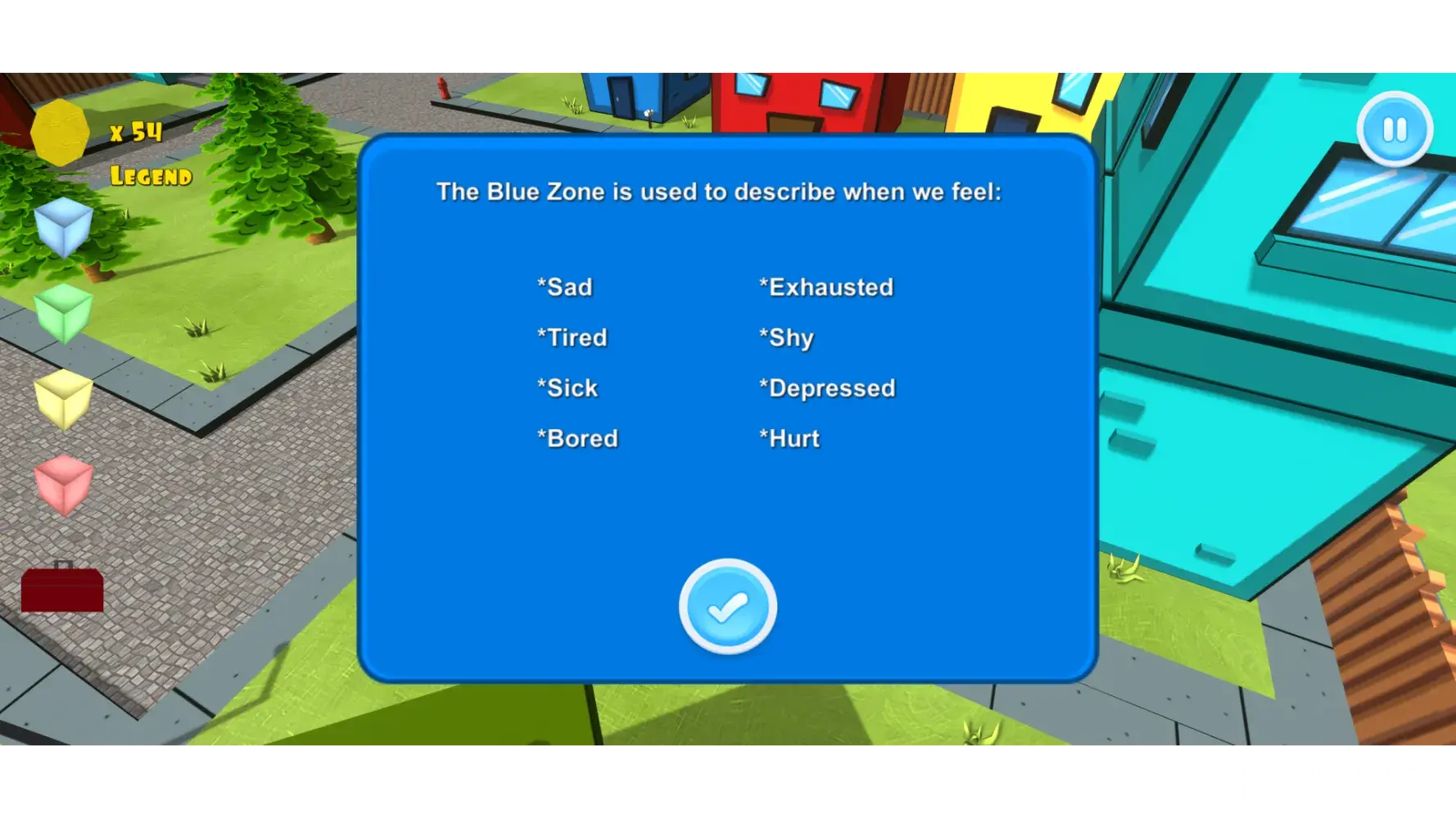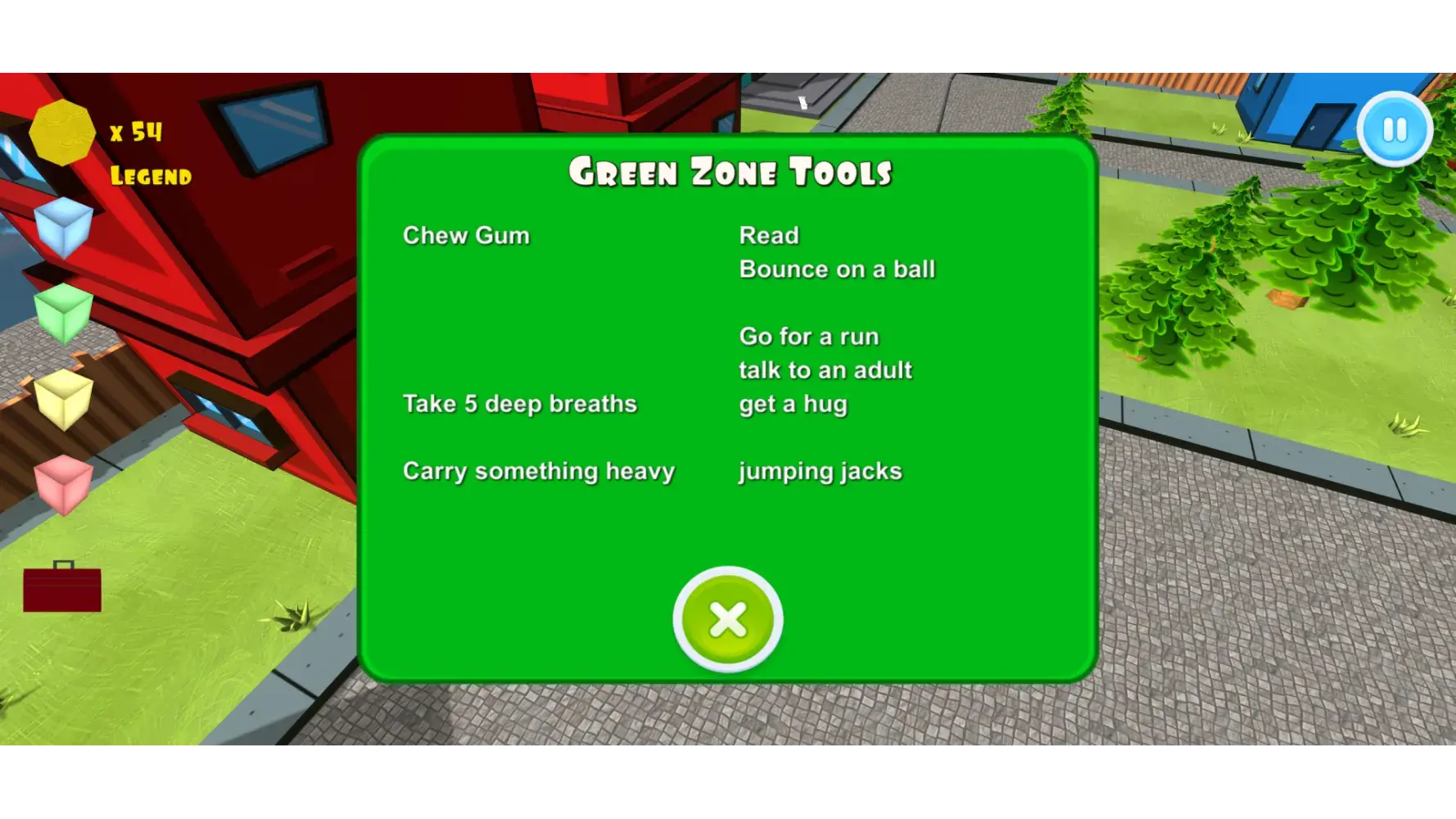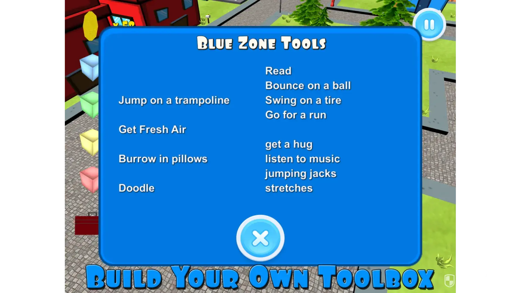 I like the concept of having a game. It makes it so easy for me to introduce zones in an engaging way, but I wish it was less like trivia. I wish it would explain why the questions were wrong, or at least allow us to see the question to see what we did wrong. Or even tell us the right answer. I feel like kids can't really learn unless they know what they did wrong. I'm also disappointed in the tools part of the application. It doesn't allow you to skip tools. One tool is "jump on trampoline", but a client who is incapable of walking wouldn't be able to do that. Someone who doesn't have access to a trampoline wouldn't be able to engage in that tool either. Also, if the tool wouldn't help, then why are you making students put it in their toolbox? The zones and the toolboxes are supposed to be tailored to the individual.