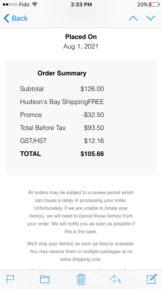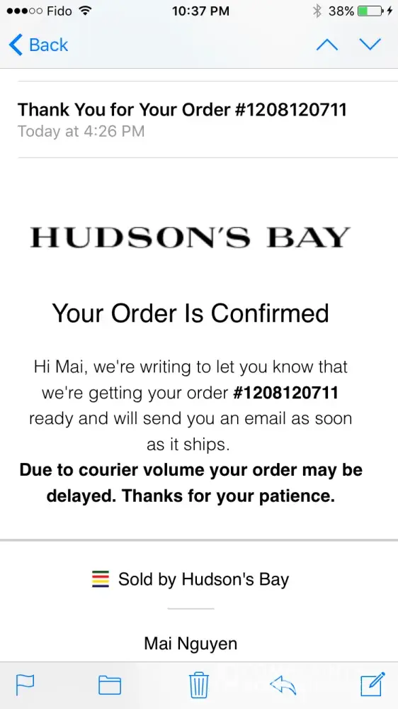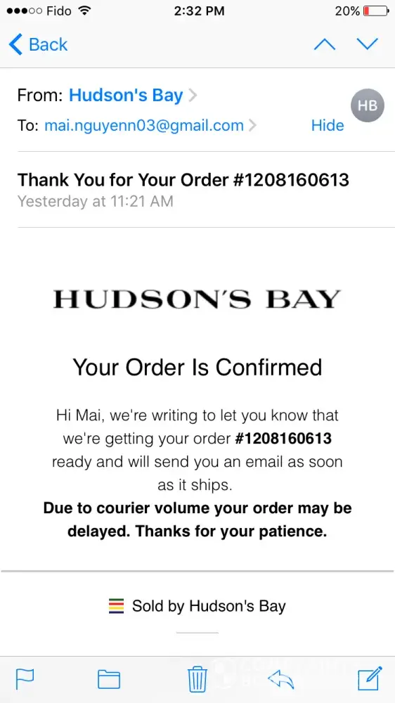 I placed an order on the Hudson's Bay website Canada. My order number is #[protected].