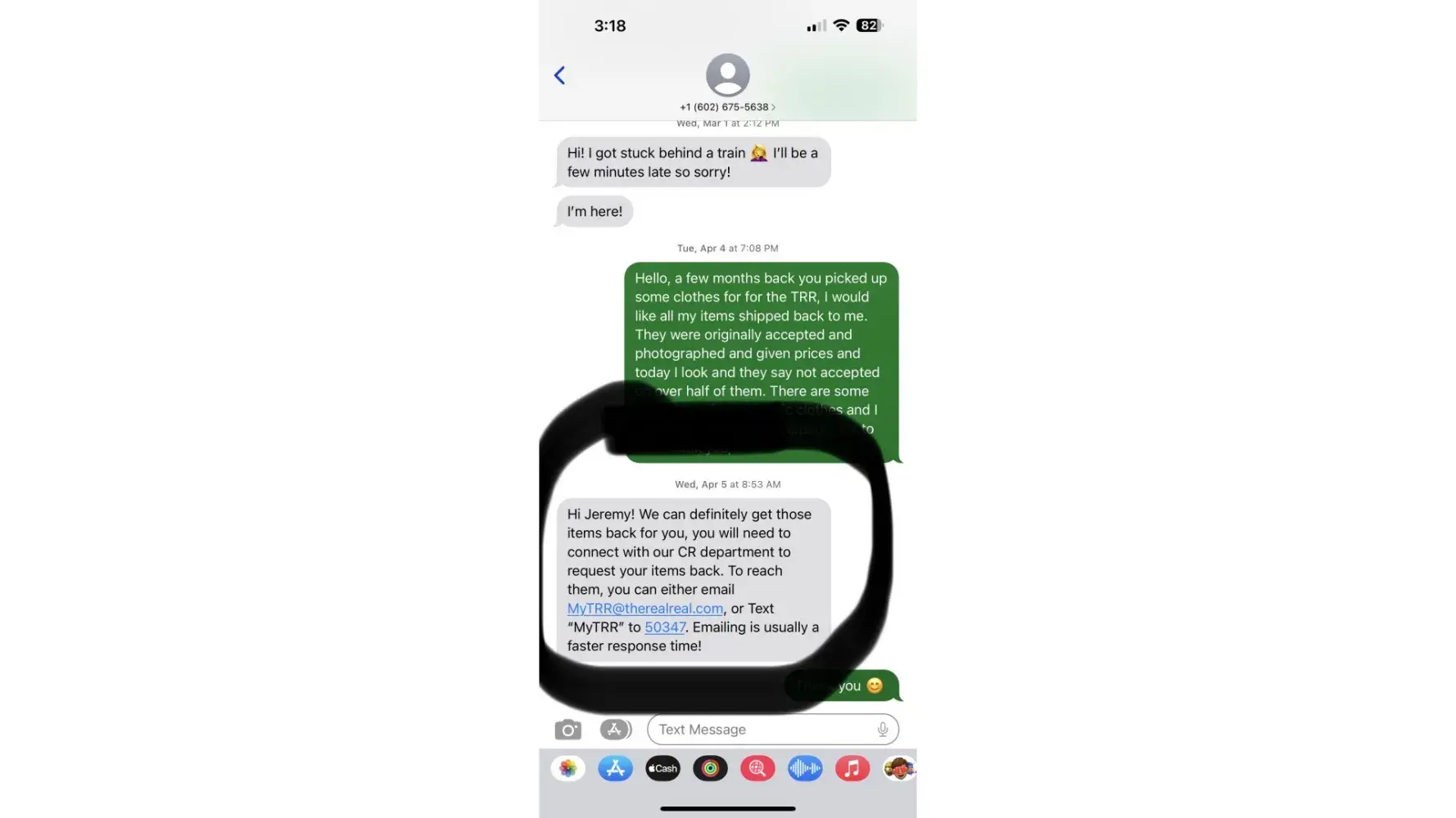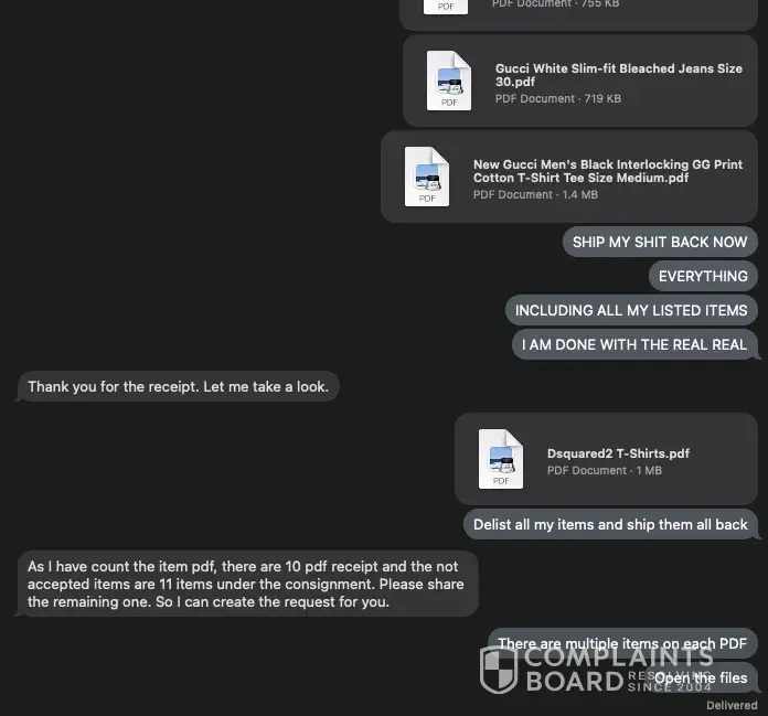 Desired outcome: I want my items returned to me ASAP and transparent communication from TheRealReal. If TheRealReal lost my things, I want to be paid the total retail amount for the two items.