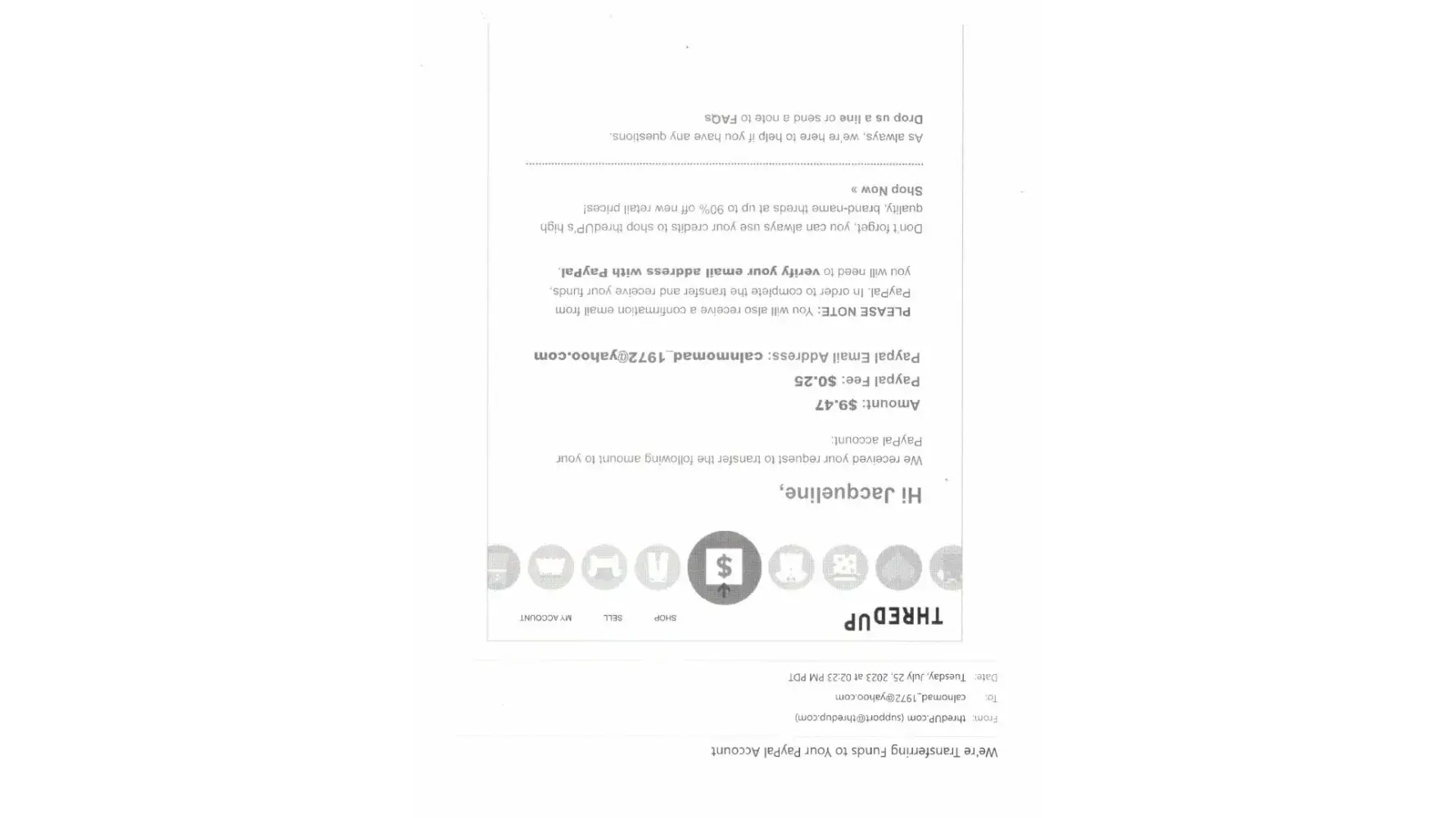 I received the following message from ThredUp - I’ve spent the morning attempting to contact this company to find out exactly what the email is in reference to with no luck. I have no idea who they are or what information they have on me and how they obtained my email address. The fact that the message began with “hey there†instead of my name is a concern.