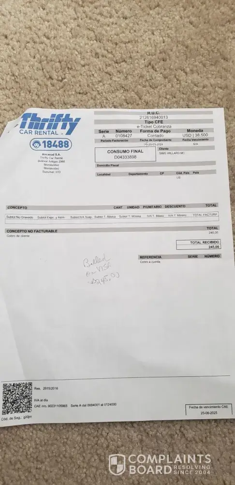 received bill .. the amount was disputed and resolved in my favor by USAA Federal Savings Bank. Thrifty car rental and USAA federal savings bank documents attached
