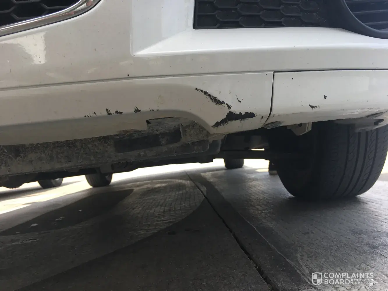 the vehicle, INCLUDING THE GLASS, looking for any rock chip that he may be able to ding us for… He then shows me the bottom/underside of the front bumper and says we caused that damage but NOT TO