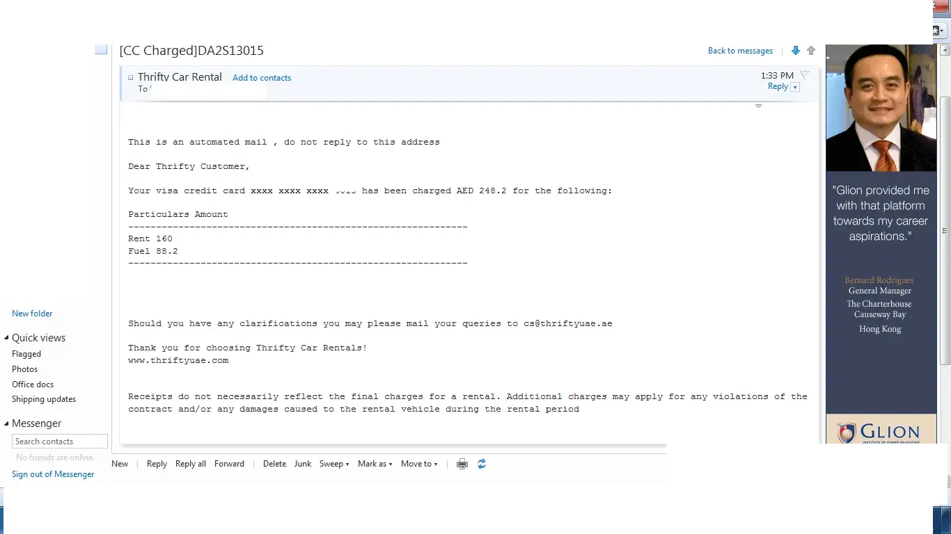 I had made a reservation online and a few days later received an email with a rate much less than the original rate. I showed this to the customer service person at the desk in Orlando and was told that he would talk to the manager. The rep then came back and told me the manager said no. I then asked for the manager and he came out. I then told him about the rate (he seemed that this was the first that he heard about it) and he said " I only push orders here". To top it off, the customer service rep told me, while I was reading the agreements, to" is there a problem, just sign it already". I want to read the agreements before signing them and I found this to be terribly rude. I then called 1-800-thrifty and told them what happened and was told that they can't do anything. I asked to speak to a manager and was hung up on. I called back and asked to speak to a manager again and after 30 min of waiting Miggy then told me sorry there is nothing that can be done. I asked to speak to her manager and was told to call [protected] which I did and Jennifer employee number 59499 just said there's nothing she can do. I then asked to talk to her supervisor and after holding for an additional ½ hour I was transferred back to Miggy 67583 told me “my best case scenario is after I have returned the rental, maybe someone in customer service might do something for me. That is the best Thrifty can do”. I then asked to talk to her manager and was told that her manager Eugne Domingo was not available. Duane Warner was the Manager "Mike" was the rep and Miggy was the customer service supervisor. No one was helpful and due to this experience, I will reconsider ever renting from Thrifty in the future and I will let as many people I know about my experience with your company.