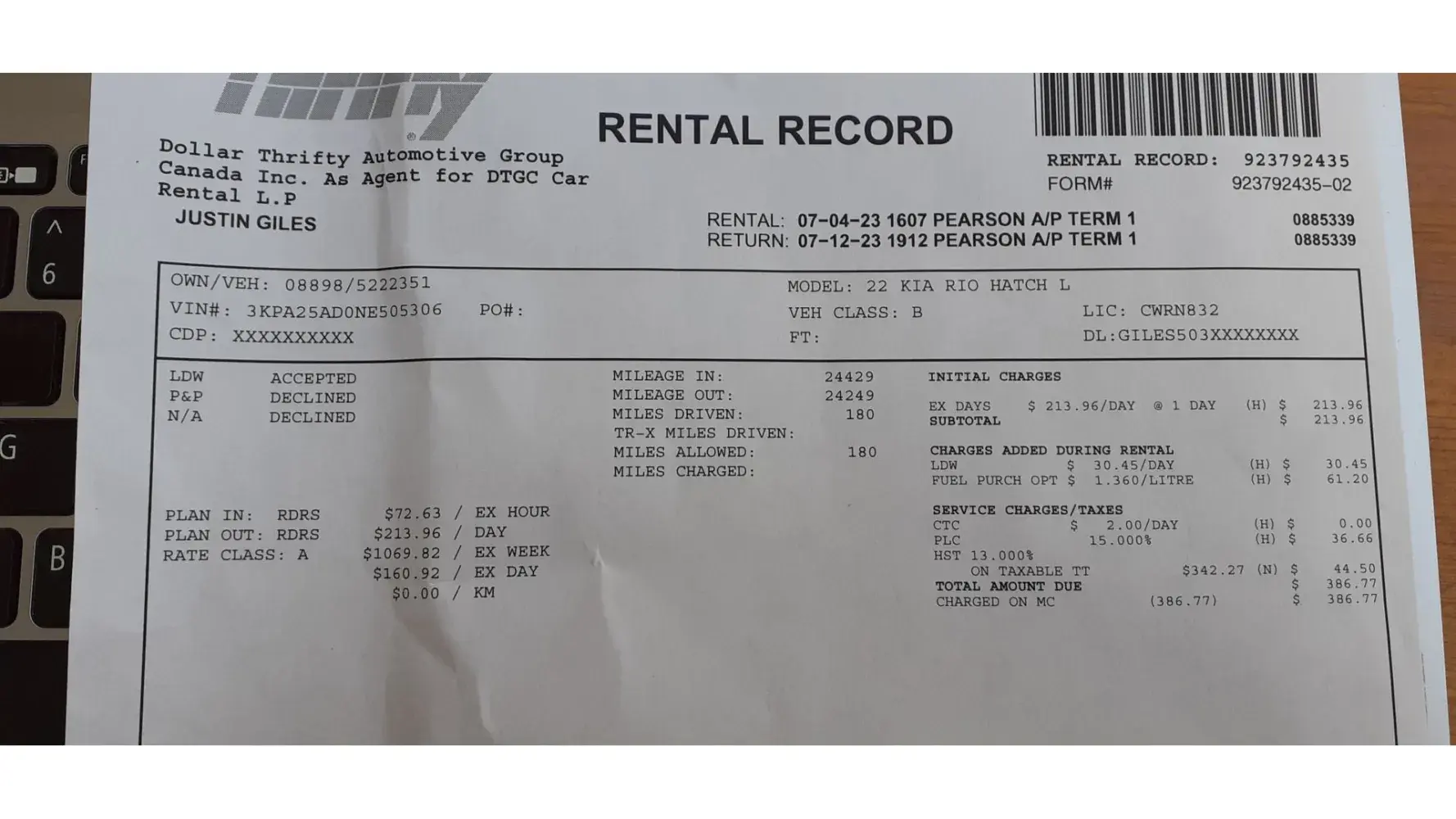 Justin Giles: Car hire from Toronto Pearson airport 4th-11th July 2023