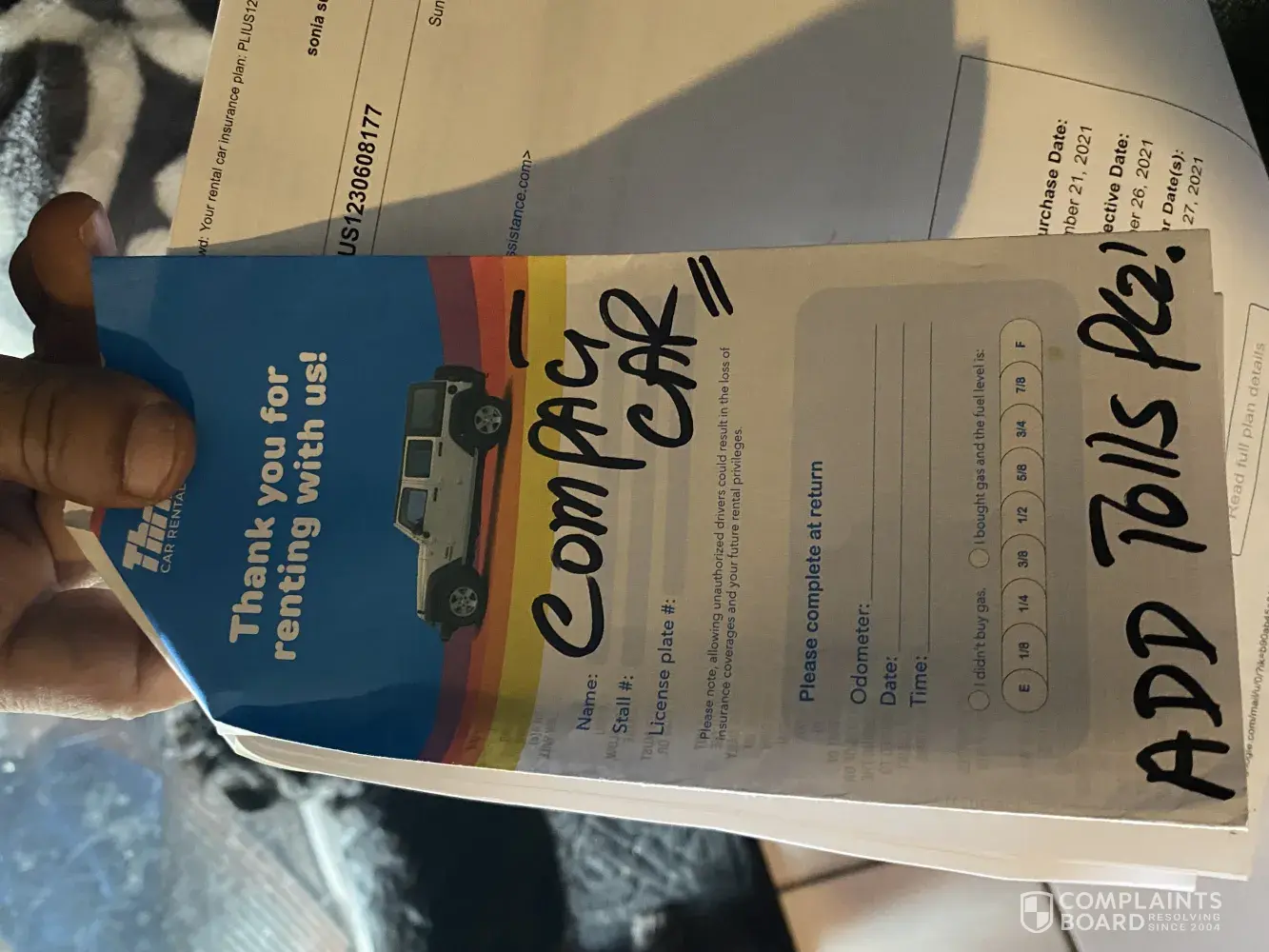 On the day of rental at the counter, the agent asked me how I intend to pay the toll. I asked him about options and he suggested ‘TOLL PLATE' he explained a flat charge of 10.99 per day will take care of ALL TOLLS. so I asked him to please add and his reply was ‘ sure will ‘. Later he hands over the rental agreement and I noticed SOME charges looked in order but the charge for TOLLS was missing. I pointed this to him and he picked up a marker and wrote in BOLD letters by hand on the jacket ‘ADD TOLLS PLZ?. He asked me to show this to the agent downstairs when I pick up the car. (IMAGE of jacket ENCLOSED.)