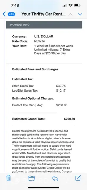 The Thrifty agreement estimated my charges of $31/day for an initial rental beginning September 14 and ending September 20. The estimated charge was $306.53. Instead, upon my return on September 17, 2021, Thrifty charged $168/day or a total charge of $663.02.