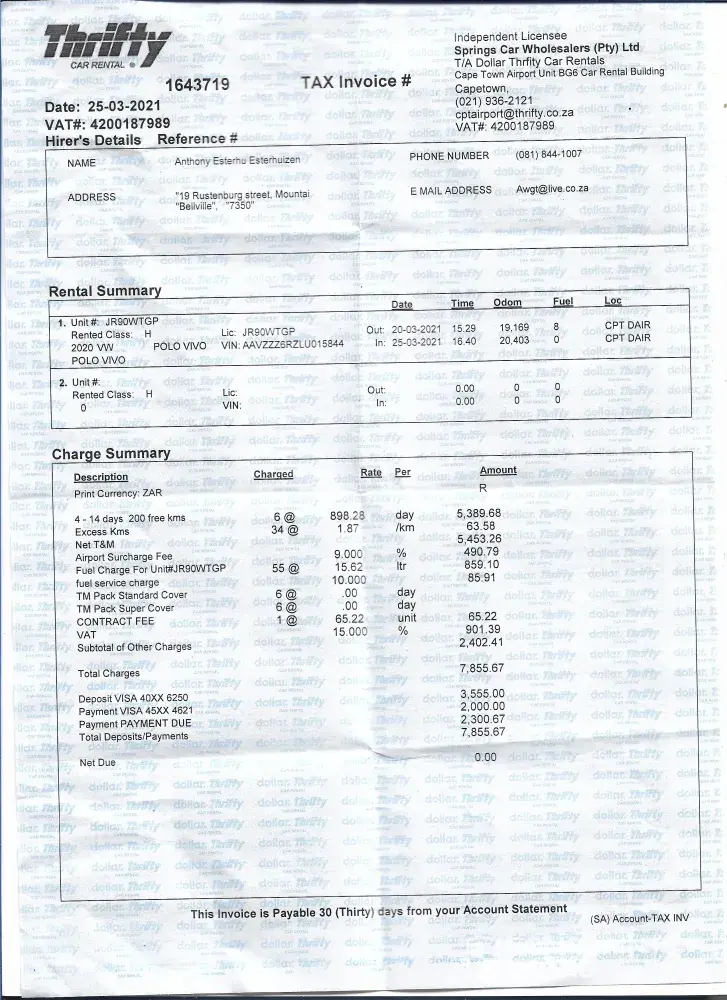 I rented a car from Thrifty Pearson Airport in Toronto on the 24th of July 2021 till the 13th of September 2021 but I was surprised that I was overcharged on my card with an amount of 8700 canadian dollars. I delivered the car with a full tank Abd as received. As agreed with them, I had to call after one month to extend and I did in the 24th of August . I was surprised that extra charges appeared on my card that was already deducted and leaving me with the problem to pay the bank for the charges that occurred with the false billing of thrifty.