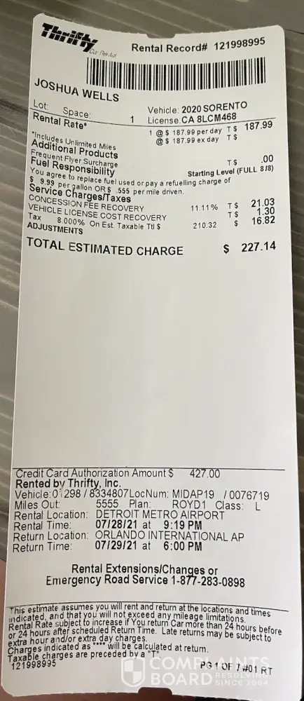 My wife used an online booking agency to book a car with Thrifty. I picked up the car in Detroit Airport on 8/26/2021. I was not given any paperwork at all, I was only asked to sign the electronic keypad. I asked for the rental agreement and was told that it would be emailed to me. The lady behind the desk told me which parking slot to head to. Once I made it to the car I noticed a lot of nicks and scratches on the car. I flagged down a person working on the lot and asked him how to record this since I was not given any paperwork. That person went to the station and returned with a blank incident form and that is the only paperwork that I used when I drove away. The rental was uneventful. When I received my credit card I saw the charge. I called Thrifty and was given an email with a 7 page agreement that had my signature on page 7 and the charges on page 1. Of course the lady at the rental desk only presented me with page 7 at the time when I signed. If the charges was near the signature box on the display screen or if I was given a paper copy of the agreement I would have been able to clearly see the charges. Now the Customer Service Team at Thrifty is not budging from their stand of the cost of the upcharges.