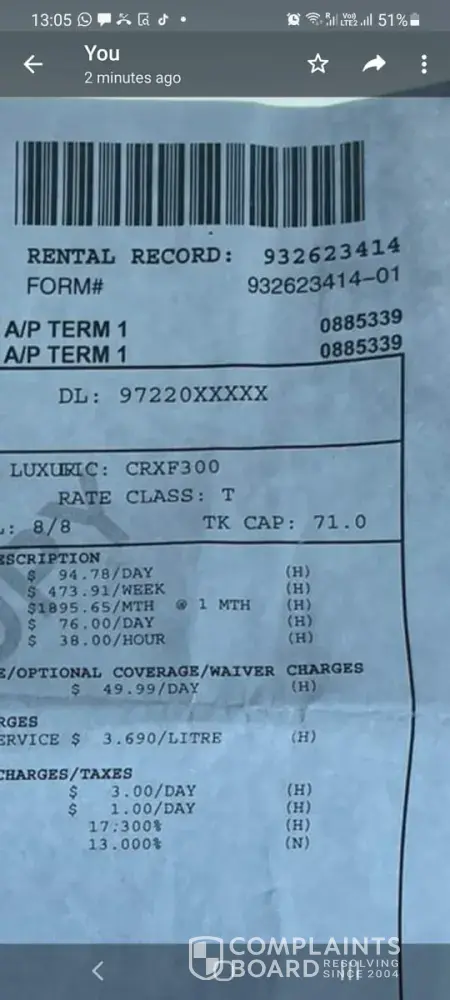• Car was returned, was told final receipt is available on-line