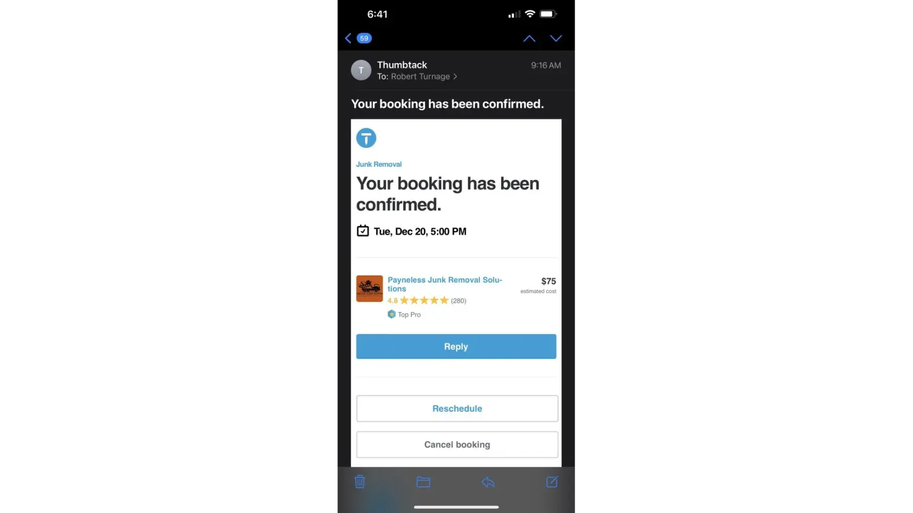 I contact Thumbtack to have someone remove a sofa. Got a quote, scheduled a time all through Thumbtack. I have a copy of the message. After the scheduled time came and went I called the company directly. Was told they had taken me off the schedule because they "couldn't get ahold of me" I had received no calls or texts. If the job wasn't scheduled then Thumbtack should not have told me it was. And the job quoted for $75 is not $125. This has happened before and I will stop using Thumbtack.