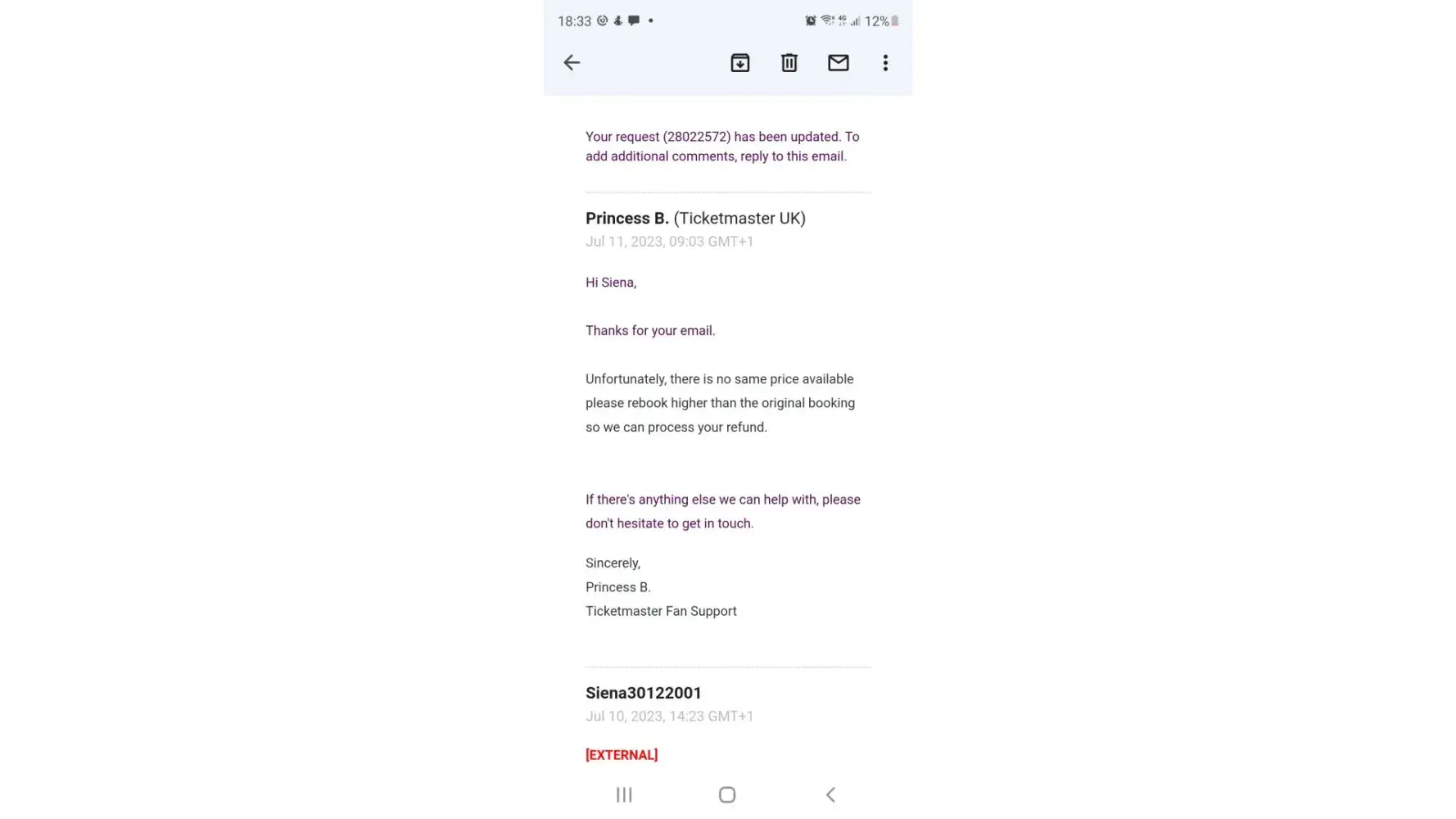 I would like this resolved because I feel it is Ticketmaster's fault for the page switch.