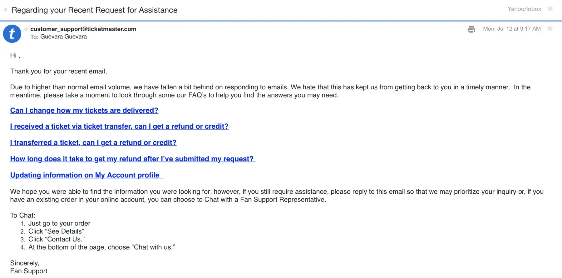 Thank you for contacting Ticketmaster Fan Support.