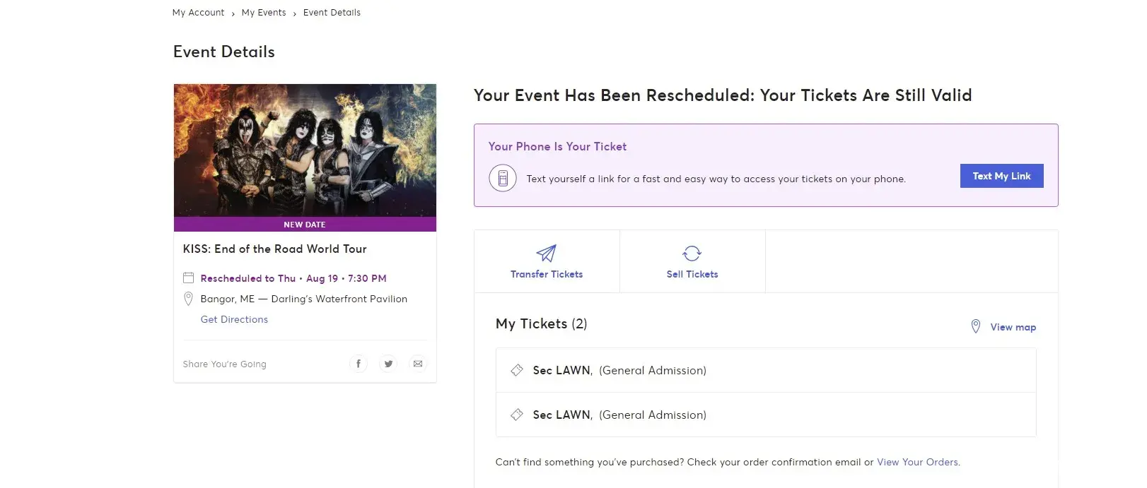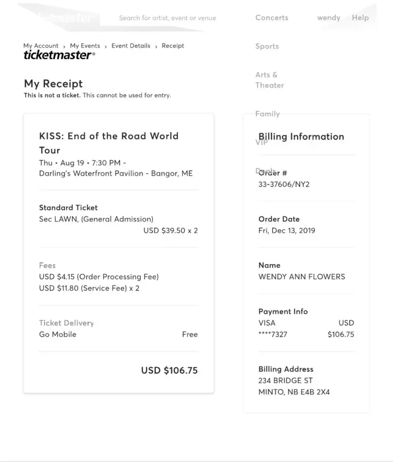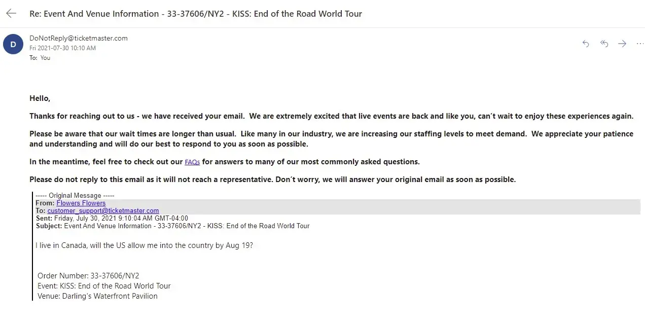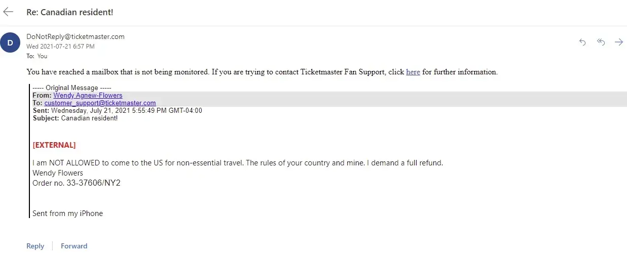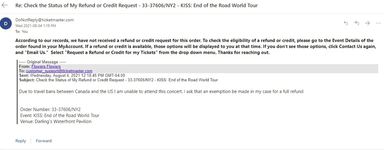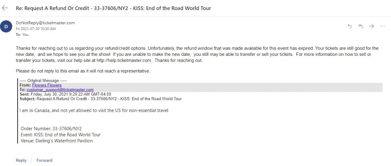 I purchased 2 tickets in 2019 to see a KISS concert at Darlings Waterfront Pavilion in Bangor ME on September 3, 2020. Due to the pandemic the concert got rescheduled for August 19, 2021. I live in Canada and due to the "non-essential" travel restrictions in place with the US government, I am not allowed to enter the United States. I have reached out to Ticketmaster several times in the past few weeks and always get the standard auto response " your window to request a refund has passed, your tickets are still valid, hope you enjoy the show" I would love to enjoy the show, if I could enter the country! I did not take advantage of the refund opportunity emailed to me in July of 2020, because I was hopeful that travel between Canada and the US would surely be resumed by mid 2021. WRONG.