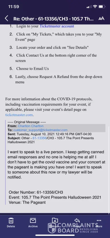 Ticketmaster refund order#4-31940/atl