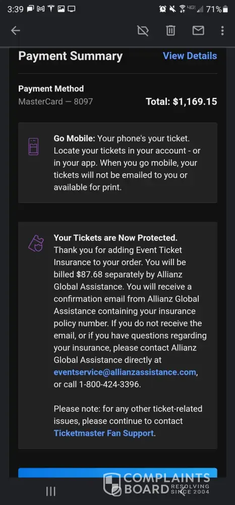 The other thing that bothers me is the Allianz Global Assistance, which they call it "ticket insurance", which is coercive because they bully you by saying "if you don't buy ticket insurance, you could lose your seat/ticket at the day of the concert", but that also translates into Ticketmaster's side business with Allianz Global.