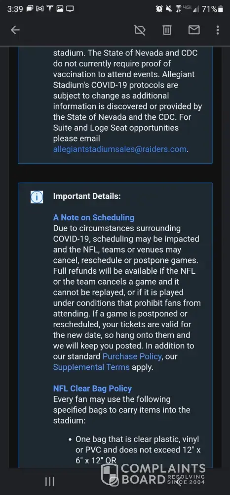August 5th, 2021, I purchased 2 tickets to the November 21st, 2021 Bengals at Raiders game. Eleven days later, Allegiant Stadium instituted a policy that anyone entering their Stadium must have received their vaccine. This was obviously not disclosed at the time of purchase because it occurred 11 days later. I am requesting a full refund of my 2 ticket purchase in the amount of $1, 169.15.