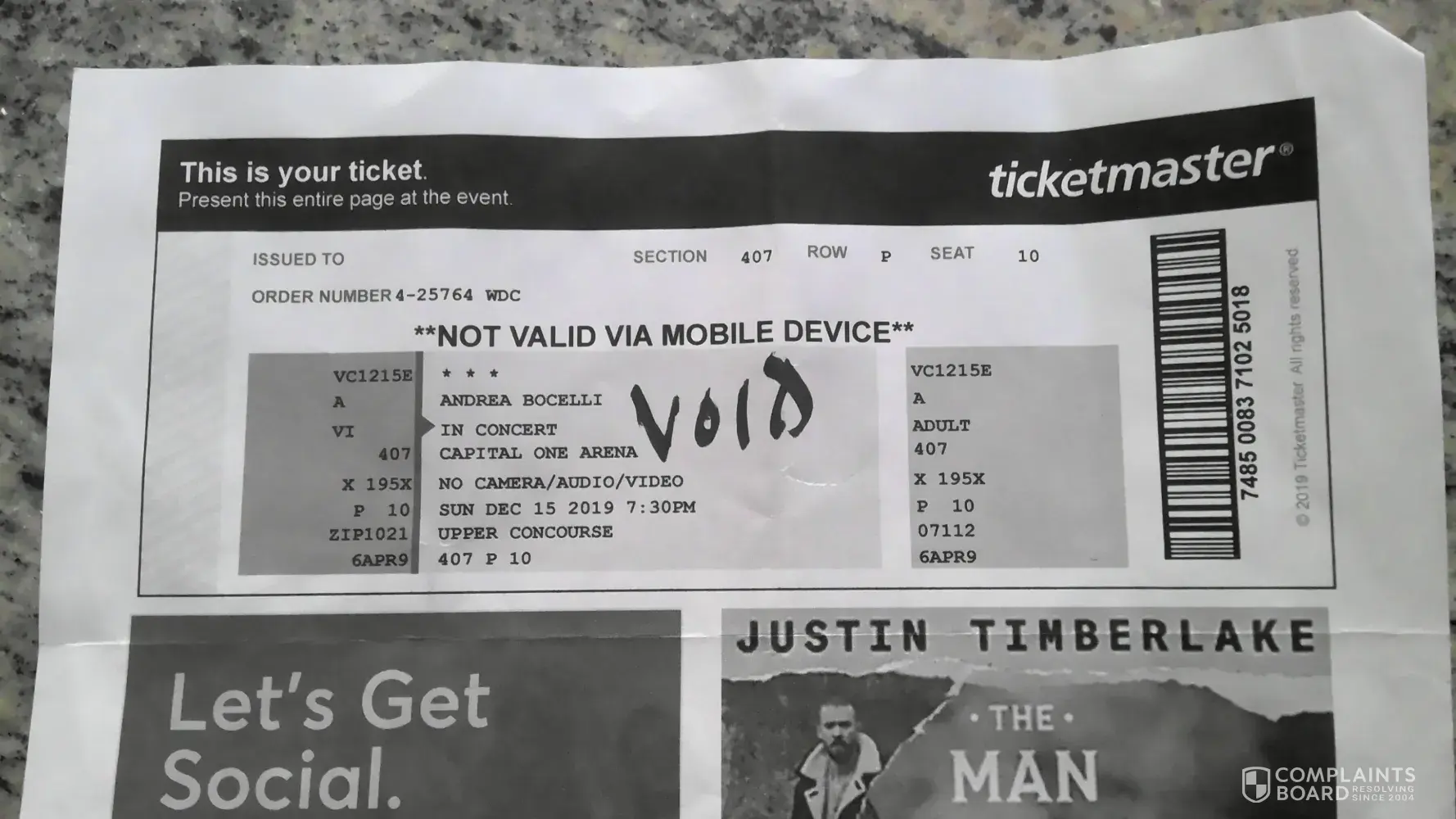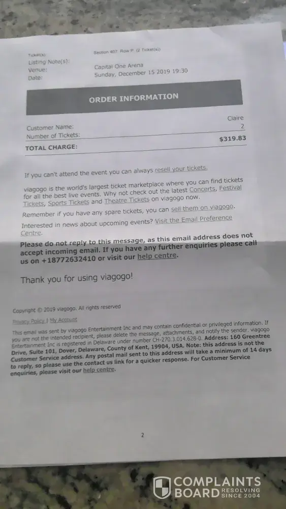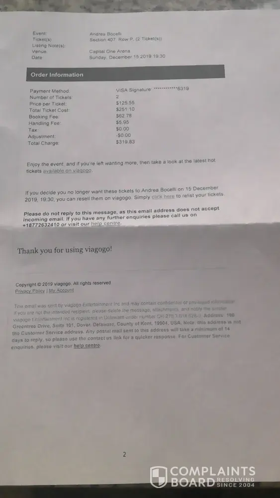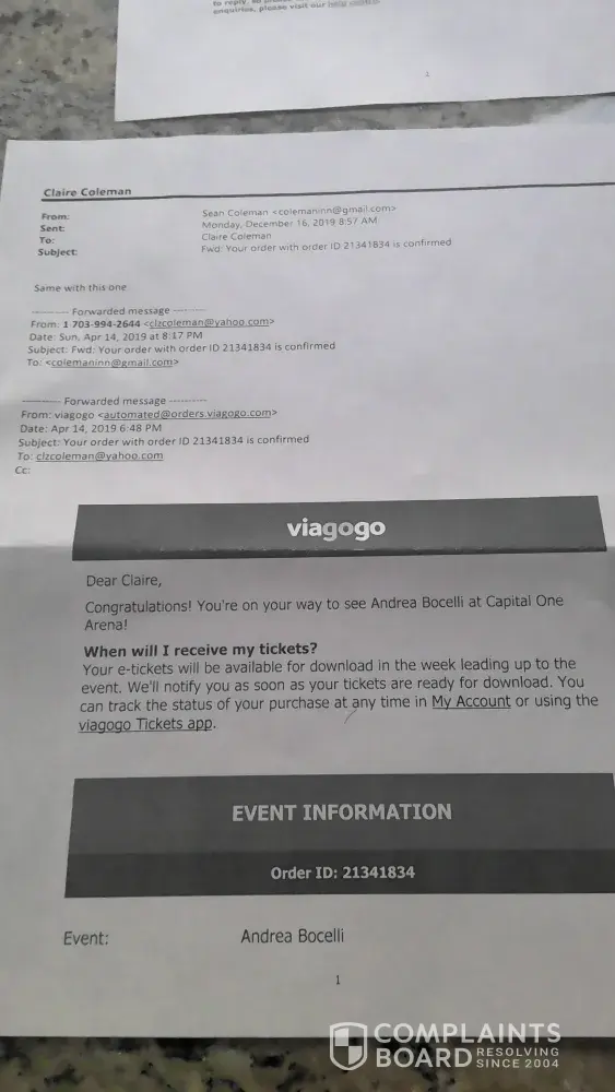 In Re: Andrea Bocelli Concert at Capital One Arena on December 15, 2019 To Whom It May Concern: We purchased tickets to the Bocelli concert on April 6, 2019 with our Chase Visa card. Tickets were emailed to us that same day and we were instructed to print the tickets. The email from Viagogo said that the tickets were genuine. We paid $319.83 for the...
