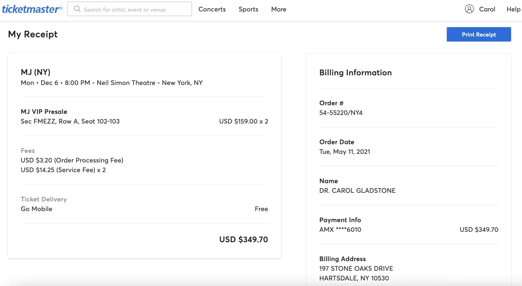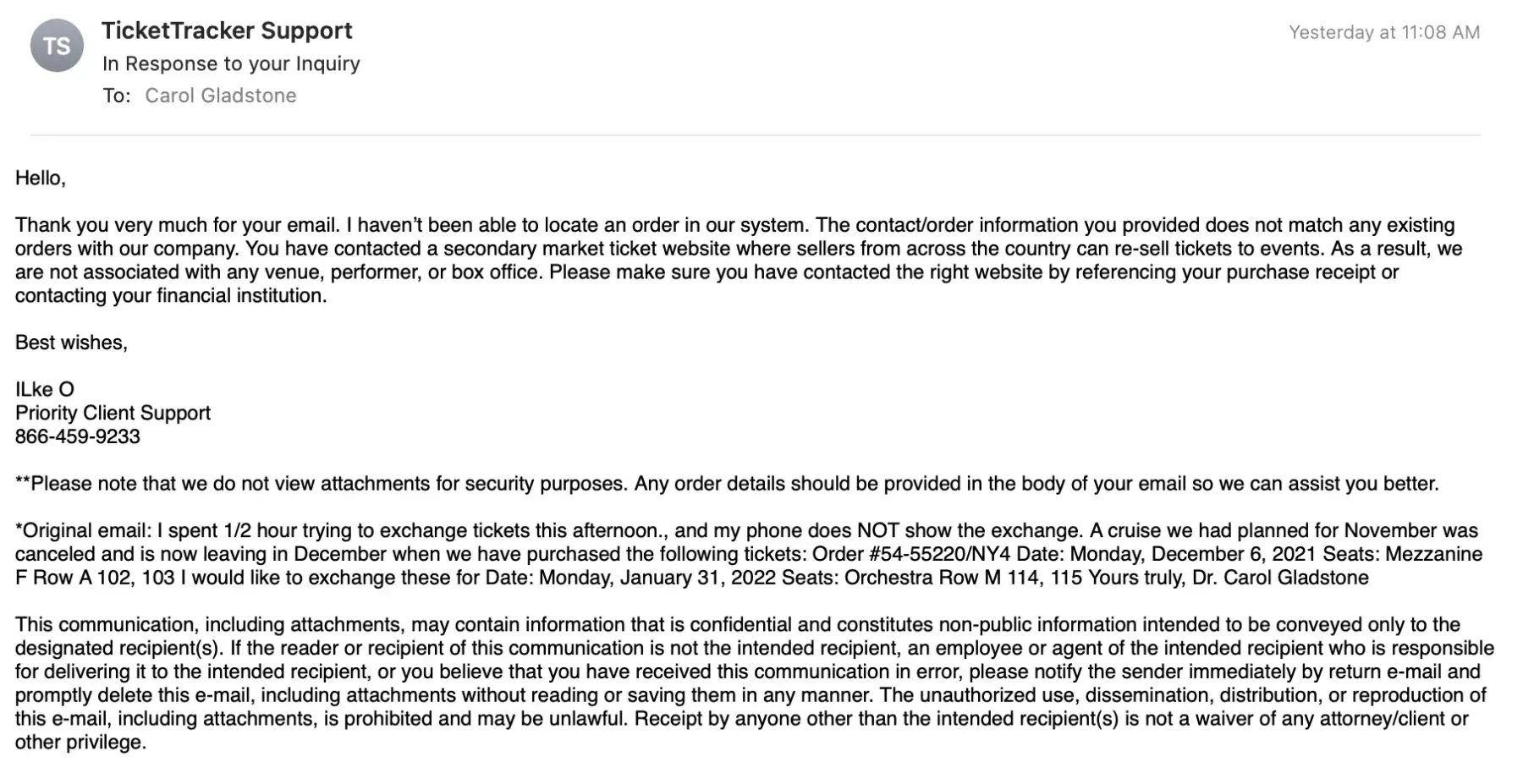 Ilke O, from Priority Client Support at Ticketmaster, claimed she had no record of my tickets.