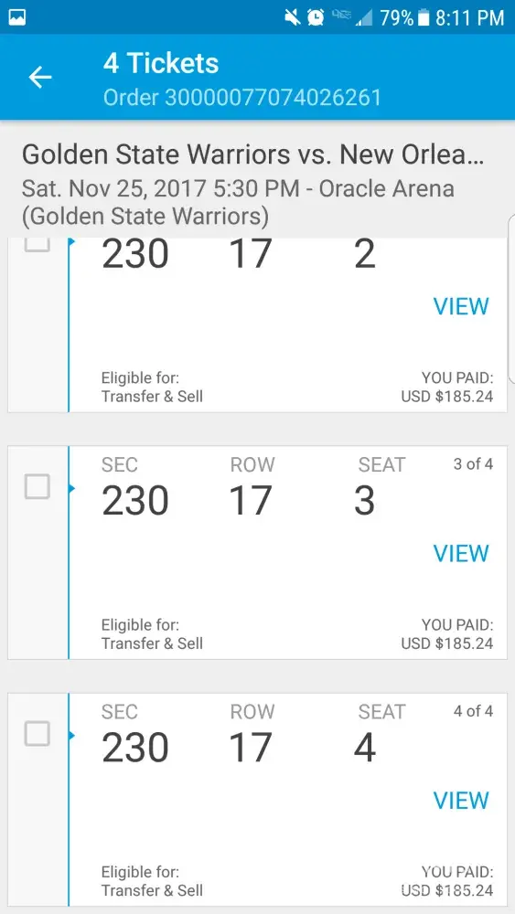 My name is Mycole Meeske. Ticket master double booked our seats to the Golden State Warriors Game (11/25/17). Let me start by saying that my partner and I flew from Washington State to be at this game tonight. We spent thousands of dollars on airfare, jerseys, travel expenses, $40 for arena parking, and our $740 nose bleed seats, all for the love of the Golden State Warriors. Tonight we were thoroughly disappointed by ticket master, the Oracle arena employees, and the franchise itself. We were sent back and forth from employee to employee, I was transferred from one ticket master employee to the next, having to re-tell our story over and over again, we missed THE ENTIRE game, and not one person was able to answer our questions, or provide us with any kind of solution. This trip was for my partners 26th birthday, and no apology or refund will give us this experience back... My heart is broken over this. I would greatly appreciate anything you could do to help ease the pain of this disappointing experience. Thank you for listening to our story, and putting up with us! I look forward to hearing from you soon, and I have faith you will come up with some way to somewhat make up for this. Otherwise you will lose several valued customers, and I will make sure I continually share my disappointing experience with Ticketmaster.