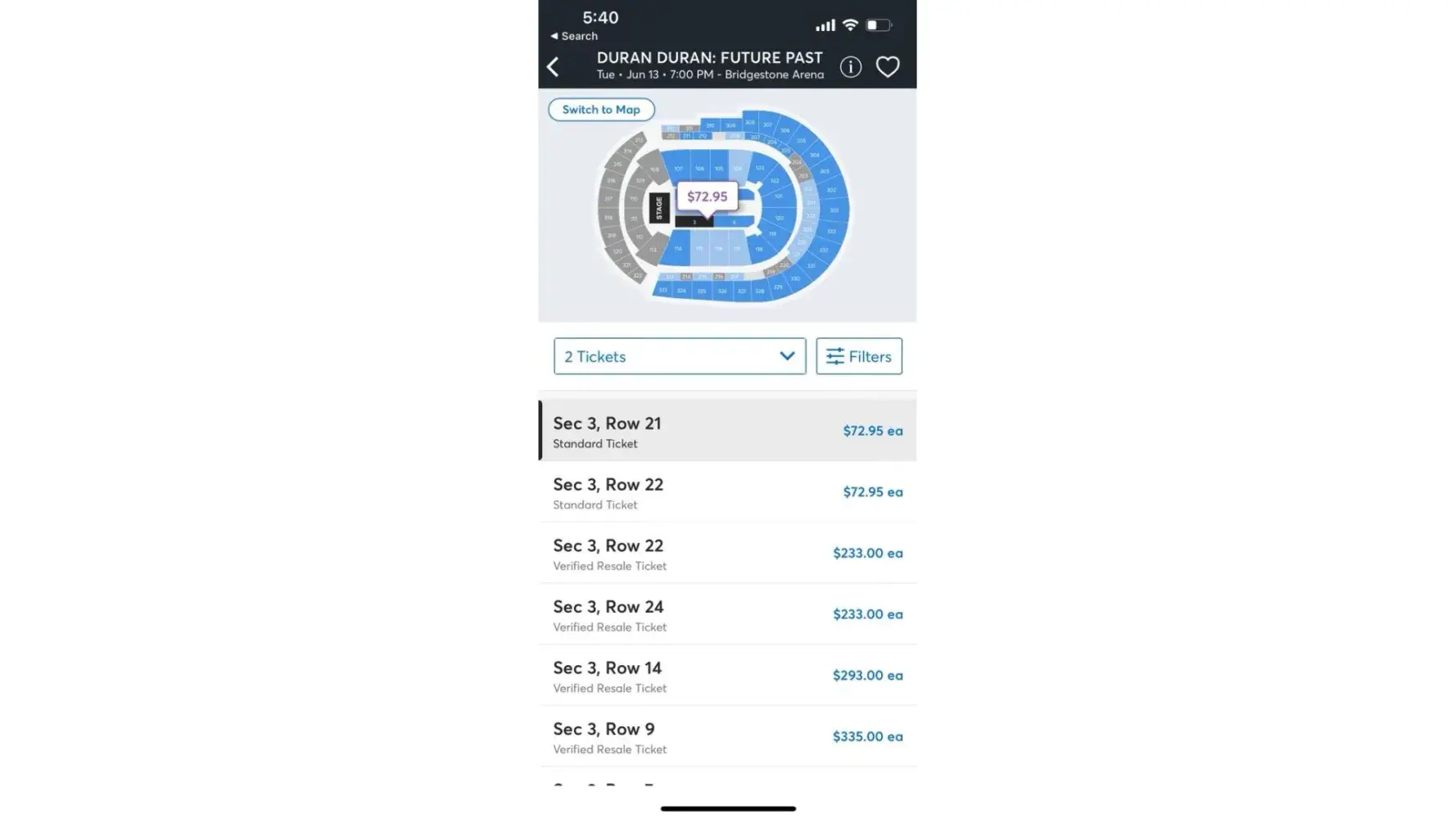 I purchased two tickets to see Duran Duran in Nashville. My seats were Section 3, Row 15, Seats 1 and 2. The total cost for those two tickets was $923.62.