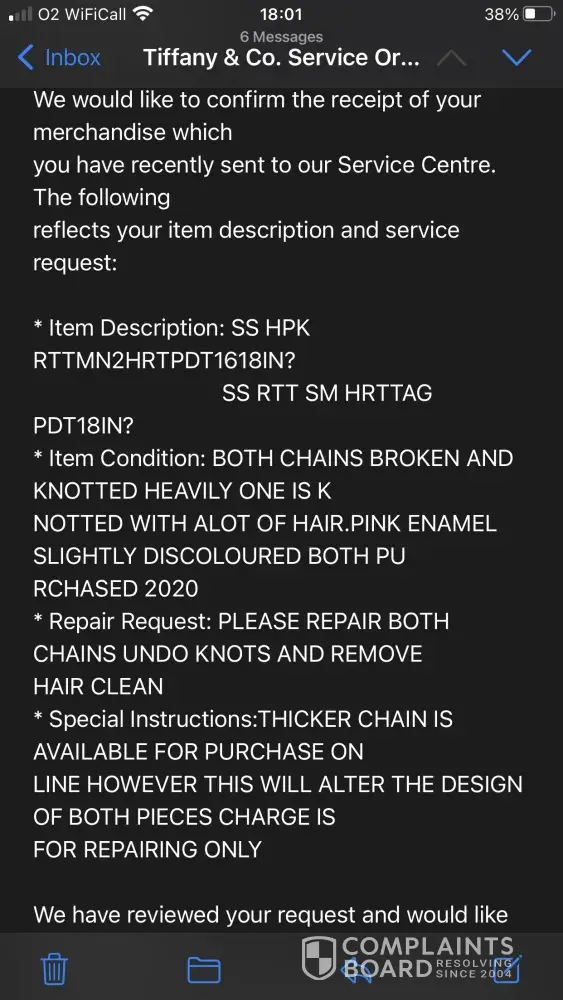 - While Tiffany & Co. has a high level of trust, our investigation has revealed that the company's complaint resolution process is inadequate and ineffective. As a result, only 17% of 40 complaints are resolved. The support team may have poor customer service skills, lack of training, or not be well-equipped to handle customer complaints.