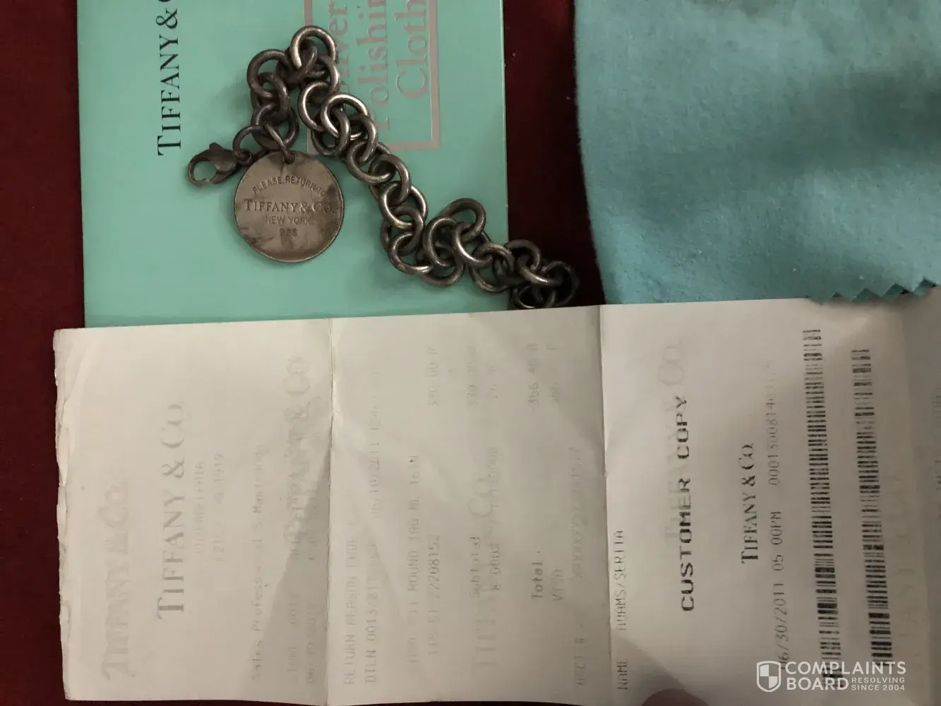 I purchased a bracelet back in 2011 and stopped wearing the bracelet back in 2014 because it was changing color and rusting. I took it back to the store several times because the bracelet kept changing color each time the store rep would clean the bracelet refusing to simply replace is. Eventually I gave up because i miss placed the receipt. I recently found the receipt and would like for Tiffany's to replace the cheap bracelet