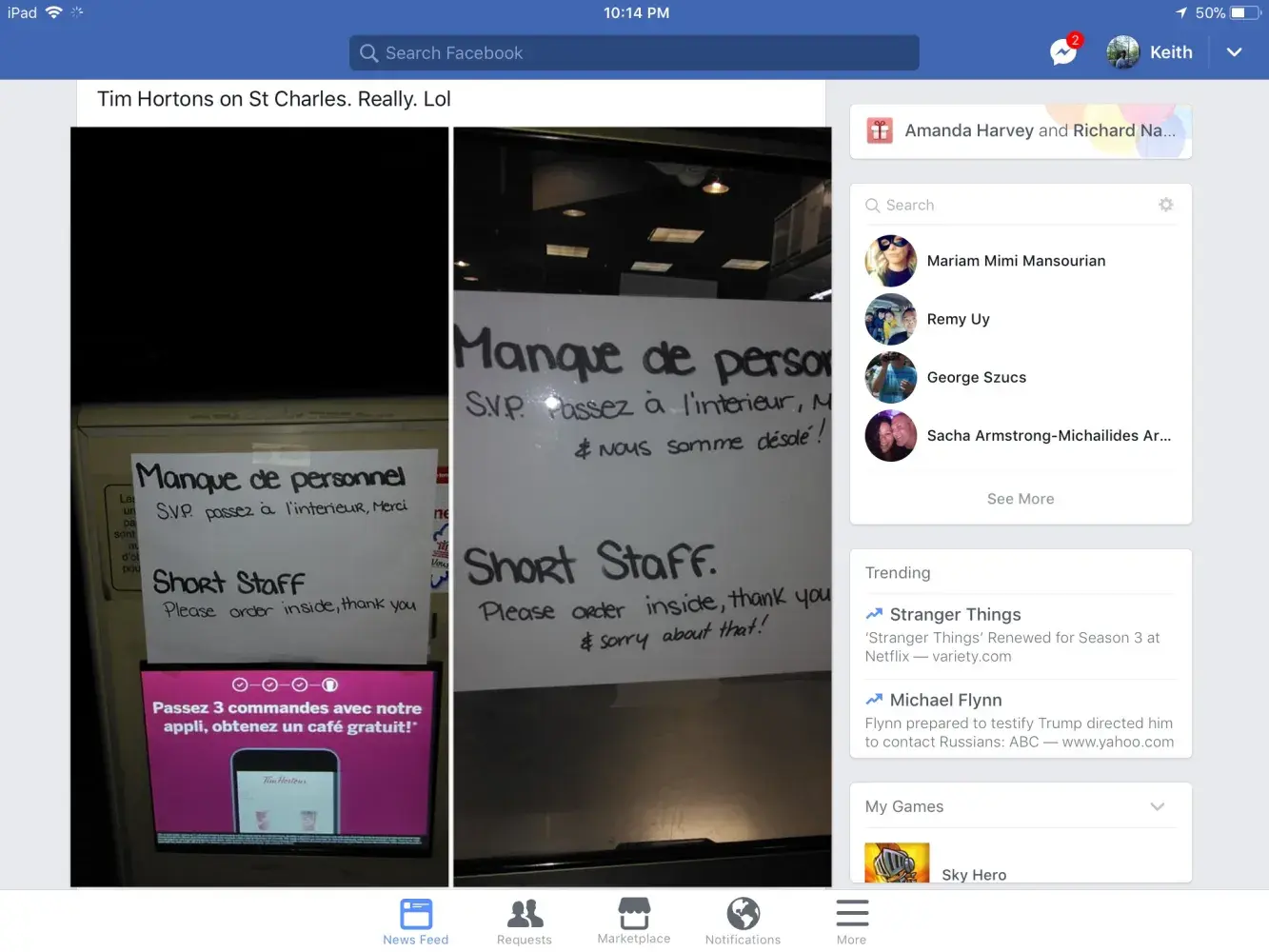 This happend at the Napanee On Route location, but it has happend to me several times in the past, at various Tim's. I'm at the front of the line and people manning the tills/taking orders are having a conversation about there lives outside of work, it takes a minute for the cashier to realize I'm standing there, I submit my order of a large reg coffee, a honey cruller and a Farmer's sausage wrap. She recites it back to me correctly, after I get on the road I realize they gave me just a plain sausage egg wrap, without the farmer's sauce or the hash brown, it was still good but not what I had ordered even though the lady recited it back to me, so I paid extra for something I didn't receive, which may have been lost in translation between her and her friend about the party they went to or what not, I'm not sure . But the cashier personally got my doughnut, who recited it back as a honey cruller.. But again on the road I discovered it was a honey dip, which I'm not a fan of. I love Tim Horton's, the food is great 90% of the time, I rarely have complaints about the locations, or the food... But service is sometimes not taken seriously by the staff... I'm not saying that's the case all the time, some locations are amazing but obviously it's happened enough times that I've decided to take time out of my day to write this dumb message to you so you know that service isn't where it should be... And you probably already know that and are trying to get a handle on it anyway, so I won't waste anymore of your time, but thanks for reading. Phil