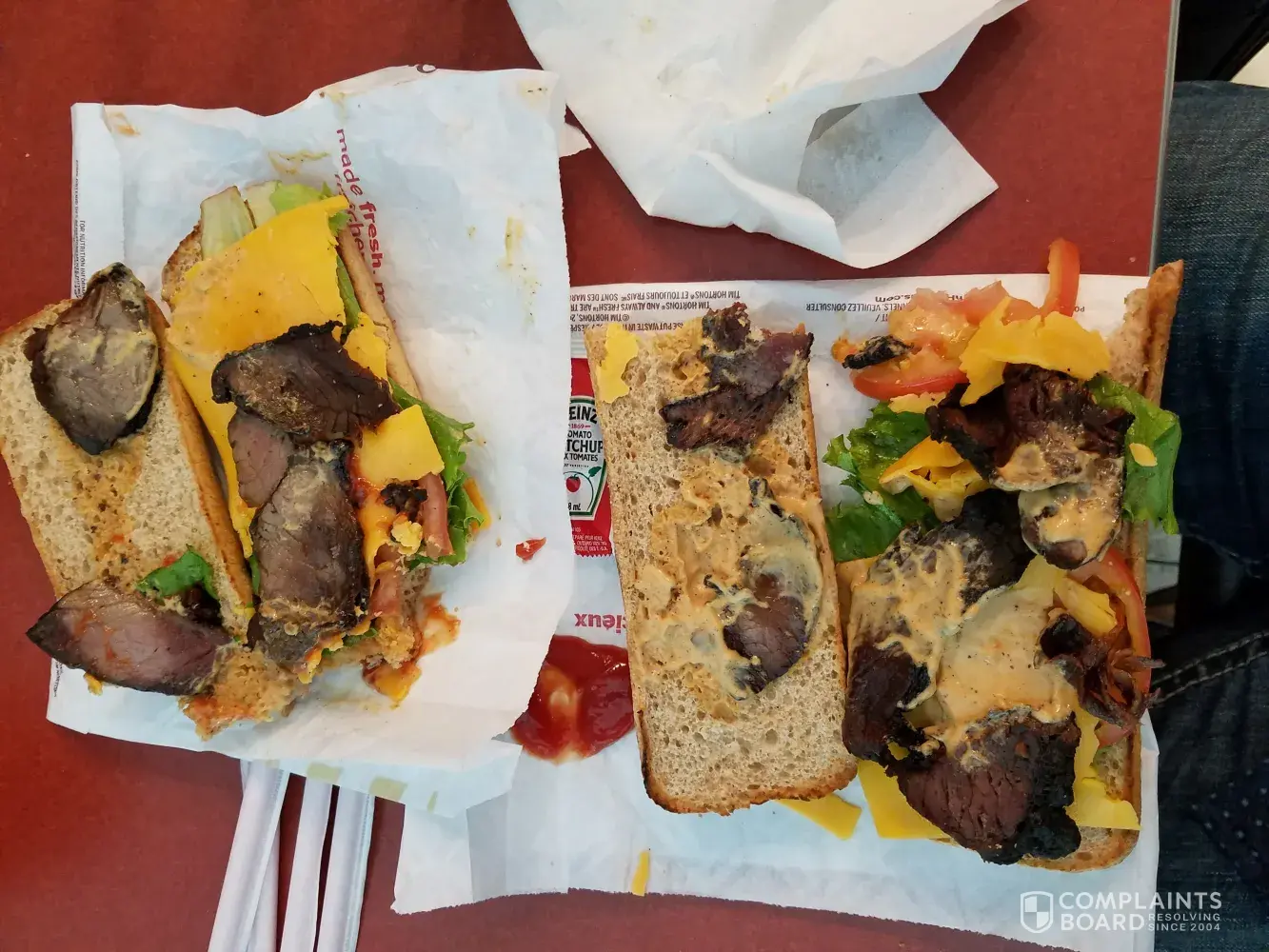 We ordered two Chipotle Steak Sandwiches of which I am send you pictures. This was the worst steak sandwich I have ever had in my life and i am 63 years old i have teveled almost all ove the world even poor countries in Arfica this tops them all. We took a bite each and trashed both the sandwiches there was no resemblance to the picture on your sign. I tell you I will not feed this kind of meet to my pets.