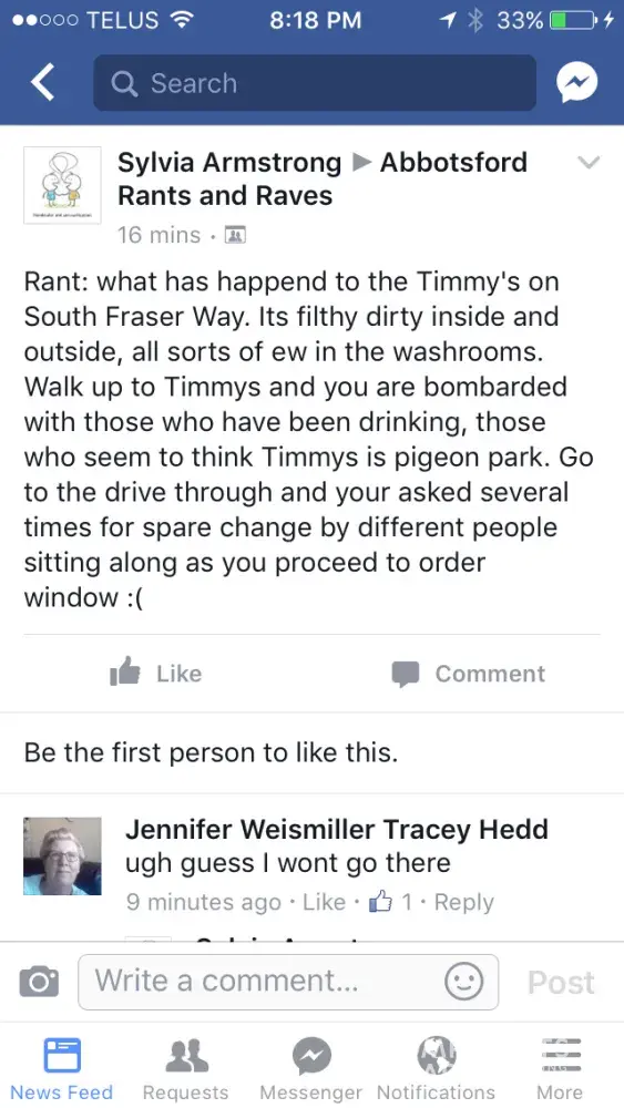 You have a Tim Hortons on south Fraser way in abbotsford in west oaks mall parking lot I want to let you know there are so many complaints about this store being filthy inside and out and homeless standing at drive thru bothering customers and sleeping by the door it it not giving you a good look at that store you need to check into things there, there are constant complaints about that store and staff