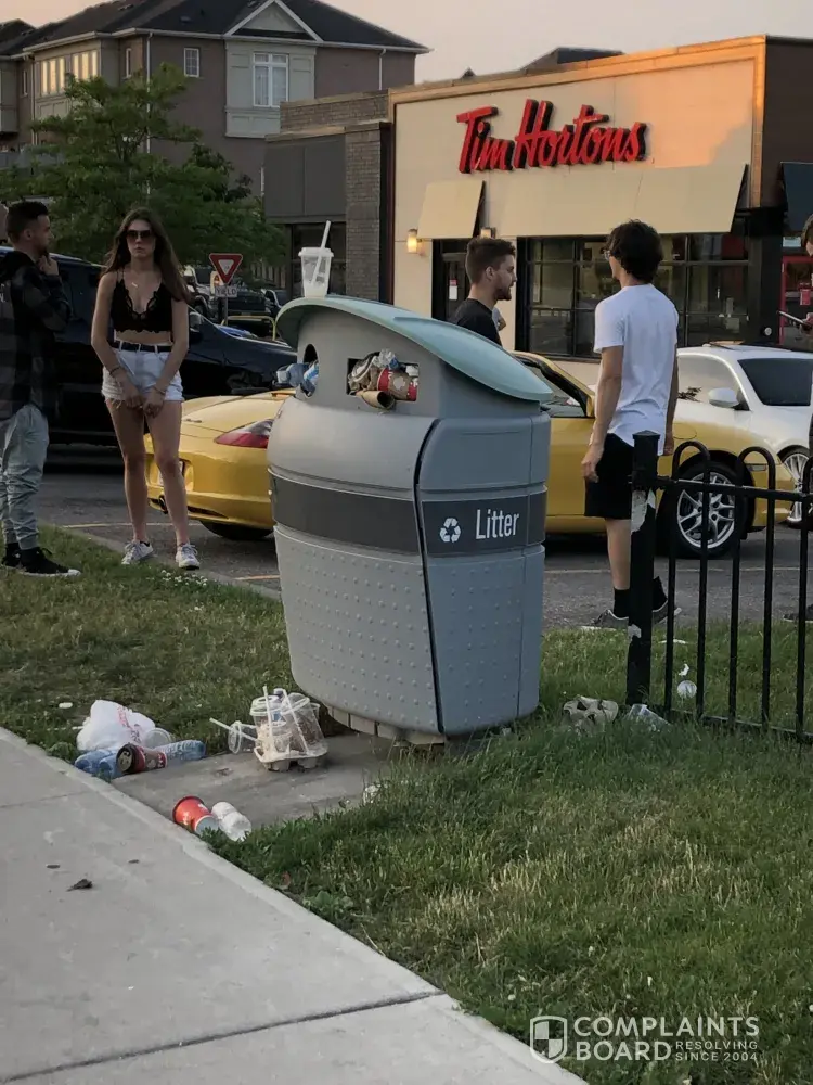 We went for a walk around the area and it wasn't a pleasant one! There was garbage from containers, plastics, paper, bins overflowing with garbage, everywhere in the vicinity of this establishment. It is Sunday evening and it's probably been sitting there since last night, Sat evening. This is not what the rest of the neighborhood is like. It is clean with hardly any litter, everywhere except around Tim Hortons. And we are seeing more of this since the summer started. Garbage bins are overflowing and it's obvious that are not emptied frequently. This is not the first time, it has been like this for years and we kept hoping that things will improve but no luck! This time, it was just too much and we felt like we need to report it since the owner is obviously not aware of the impact on the community.