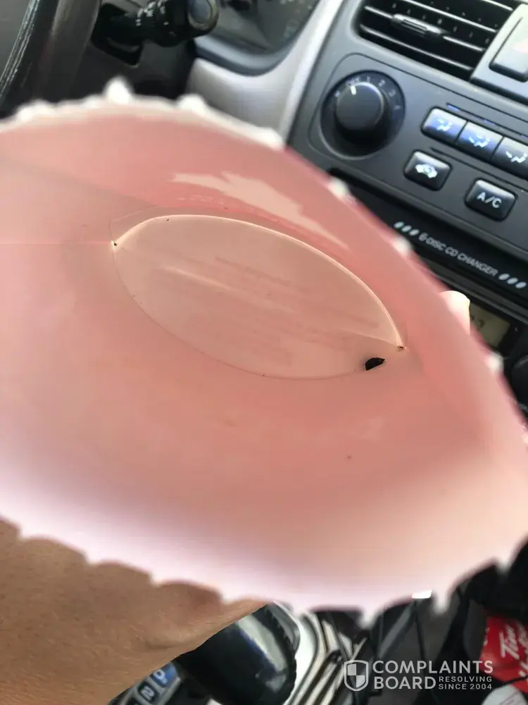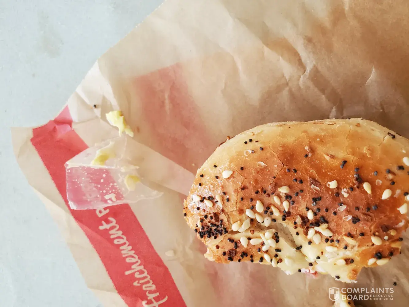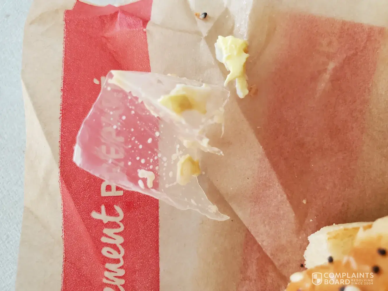 I received a bagel BELT on April 30th 2021. While eating it I noticed a strange taste and texture and spat out the piece of the sandwich I was eating. Upon further investigation there appeared to be a piece of plastic in the sandwich. It appeared to be a piece of plastic from the corner of a sauce packet or something that was cut off and ended up in the sandwich.