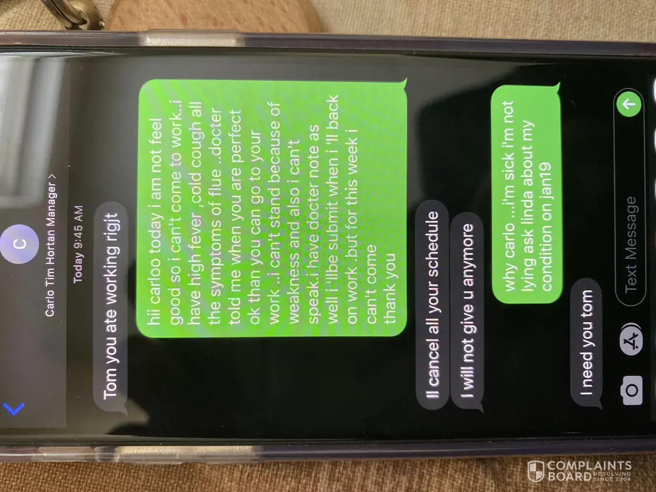 Hi, I am Manjot kaur working at Tim Hortons. My manger Carlo making discrimination with me. I have Flu and have doctor's note for that and requested my manager that I cannot able to come this week due to flu but my manger text me rudely and remove my all shifts from next week also. This is the second time he did this, a week ago he told me that he will kick...