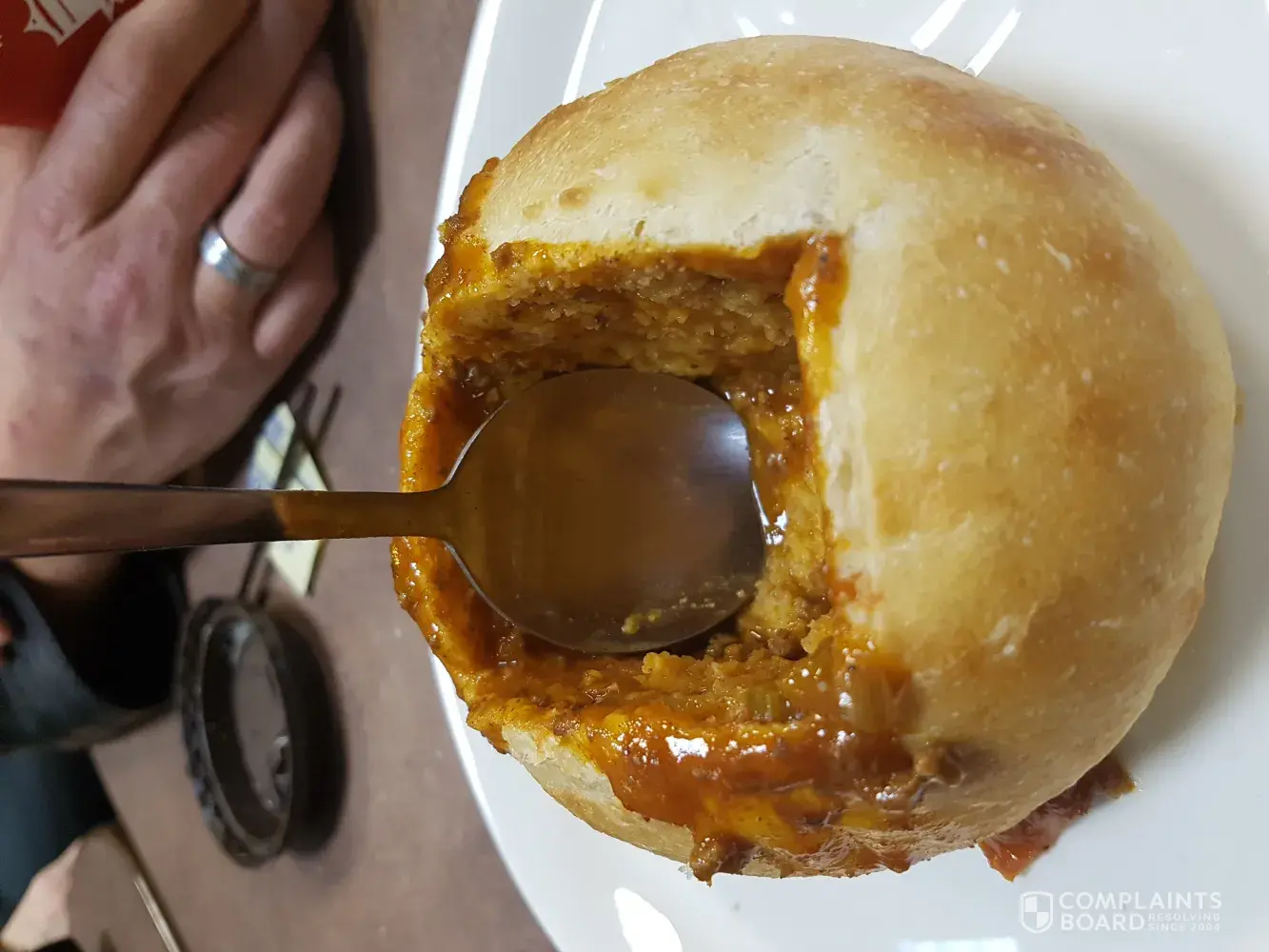 I'm really depressed as I was diagnosed with ms this last year and its getting pretty bad but when I saw that you had chilli in a bread bowl I actually feltbhappy for the first time in a long time. Then I got it 4 spoon fulls of chilli and a bun with a wedge cut into it. I was more disappointed then anything. I'll let the pictures talk.