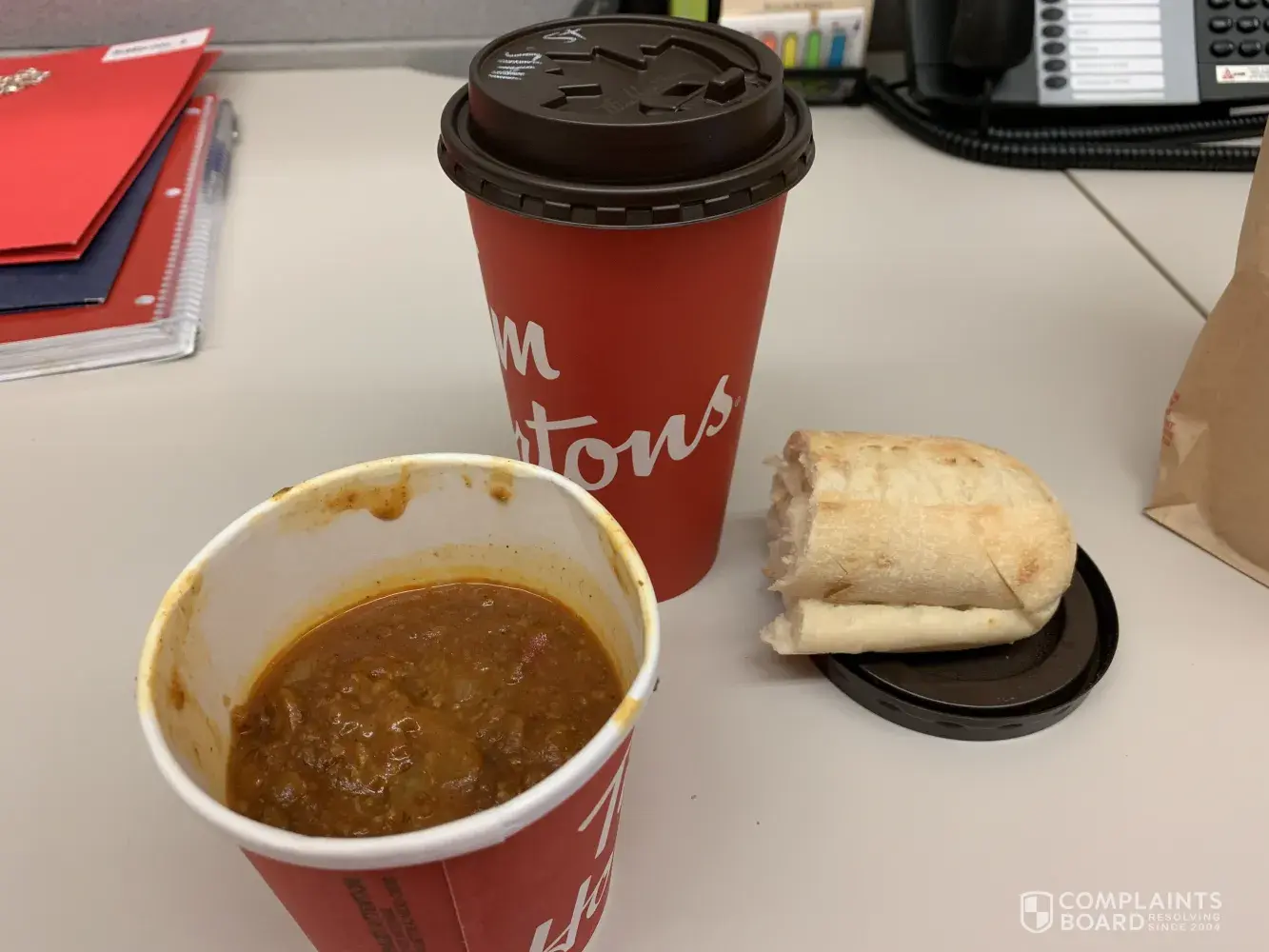 Recently ordered and paid for a large chili combo and the cup wasn't even full. This was on my lunch hour so my time is minimal, so I could not run back and spend another 15minutes in store waiting for this to be corrected . The tea that came with my combo was luke warm. I was not asked whether or not I wanted a whole wheat or white bun, staff selected this for me. I am a daily visitor at Tim Hortons and this has been the worse service and product I've received