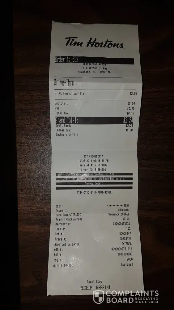 I went to this Tim Horton's today with my wife and I made a fairly simple order. As I drive me vehicle up to the window to pull the bill and get my food. I noticed there was a wrap in my bag witch I did not order and they where missing my food. So I pointed it out to a lady that works there with all respect possible by the name of rohgul. And I would like...