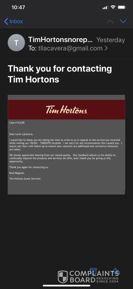 Hello . I wrote customer service re:a breakfast sandwich that was purchased oct 10 at the airport terminal 3 at approx 6am . We just took everything close to the boarding waiting area as it was close to boarding time so I didn't have time to take it back. But I did hear from Tim Hortons and I'm not accepting a standard letter response! I'll send u the pic and you tell me you'd eat it? I lost my appetite and didn't eat it all and I was hoping at the least for my money back . Obviously I'm too far away but even to send a gift card would've been a great suggestion? Thanks for listening to me . Lorie