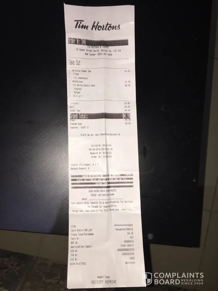 Complaint sent through Tim Hortons website, unanswered for more than one year... and counting.