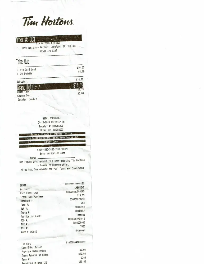 Tim Hortons tim card / quality