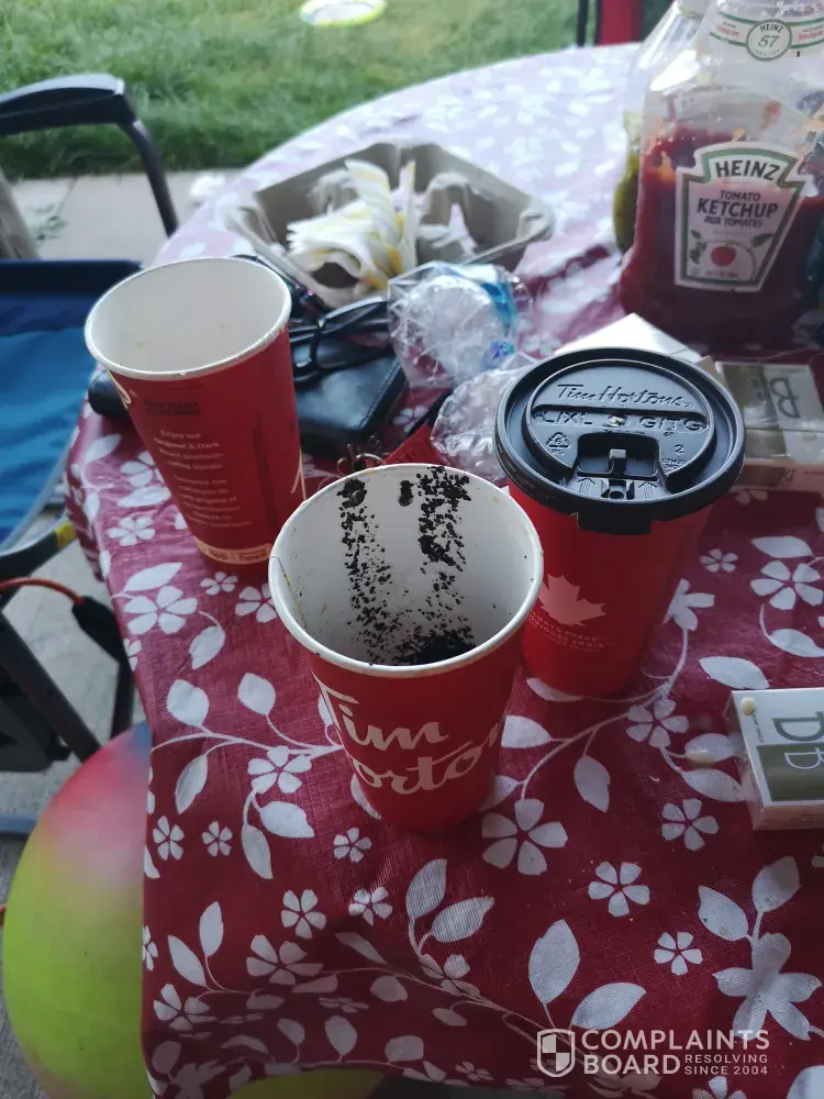 I went to the tim Hortons drive-thru on upper Wentworth by limeridge mall around 755 in Hamilton I ordered three large triple triples all three are full of coffee grounds after finding out with the first coffee I poured the other coffees into other cups and they are just as bad I will be submitting photos and I'd like to be compensated this is disgusting to get a mouthful of this my phone number is [protected] I feel there should be some compensation for my troubles