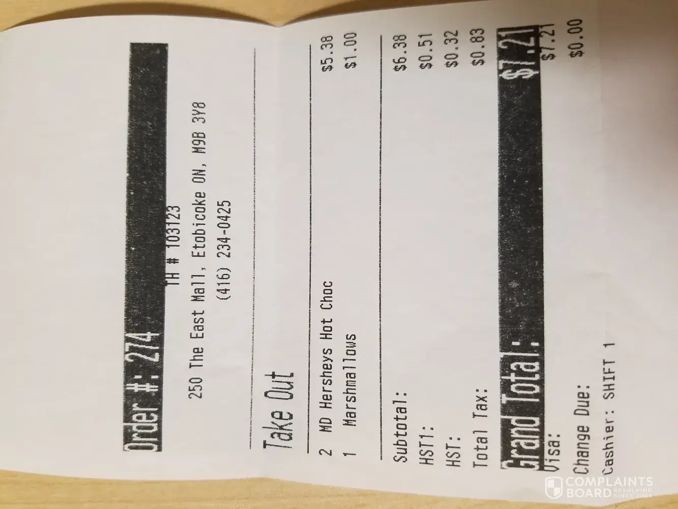hello, I ordered a medium Hershey hot chocolate with marshmallows, was charged for marshmallows, however, didn't receive marshmallows in my hot chocolate. I have provided pictures for your review, I would like to be reimbursed for my hot chocolate. I have never complained however I have been receiving orders that are incorrect more often than not so I thought I should say something now.