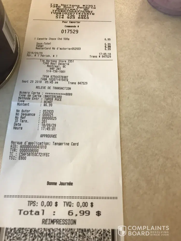 View all Tim Hortons reviews and complaints