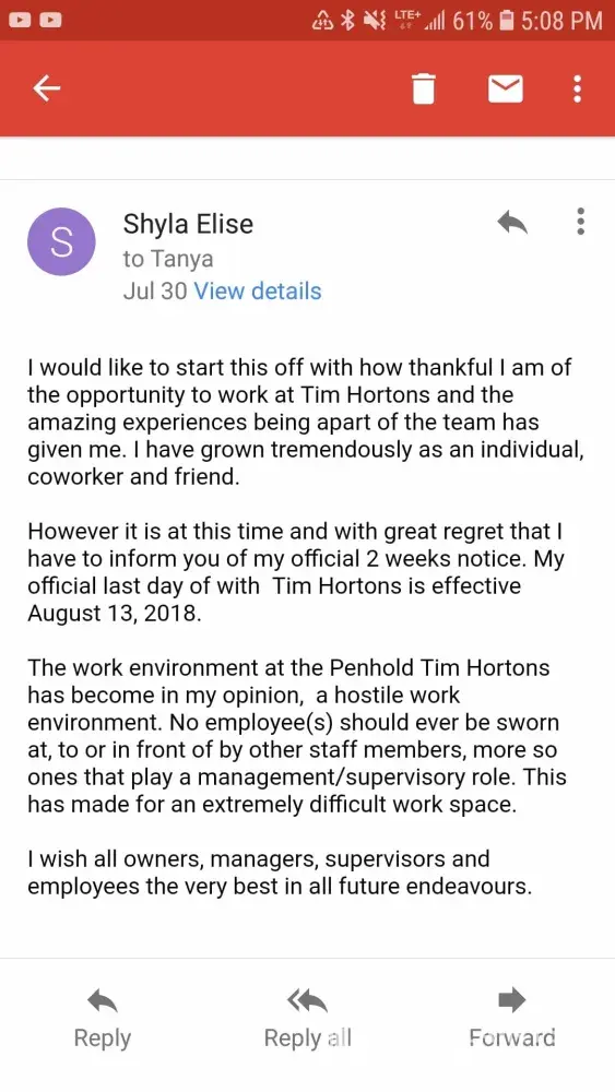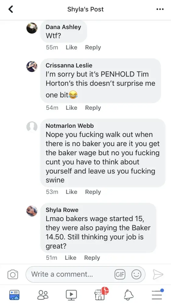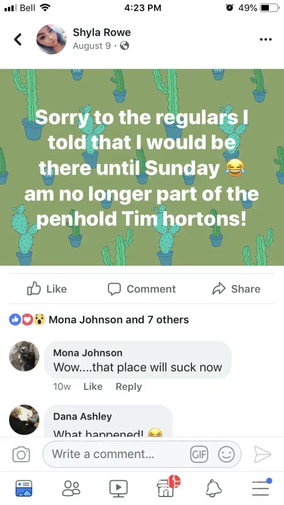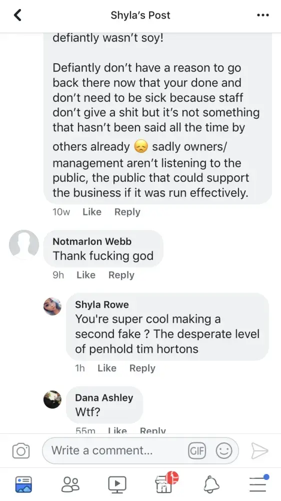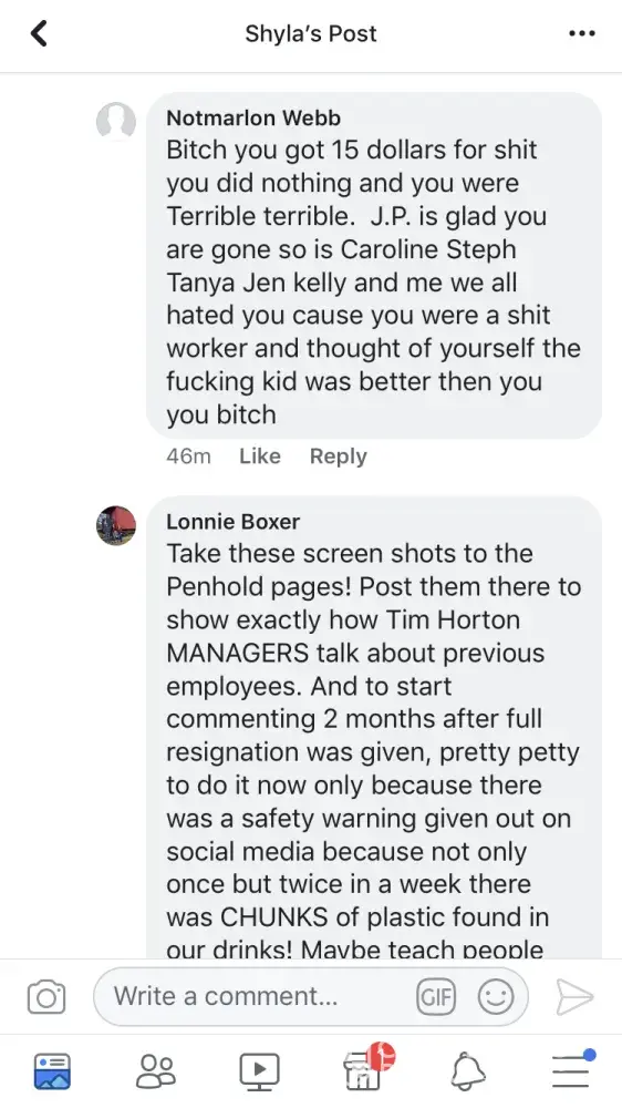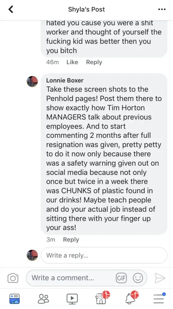 And this is acceptable from TIM HORTONS Managers in Penhold AB! Please see photos on how a Manager in Penhold responded to an innocent post 10 weeks after another staff member resigned due to a hostile work environment.