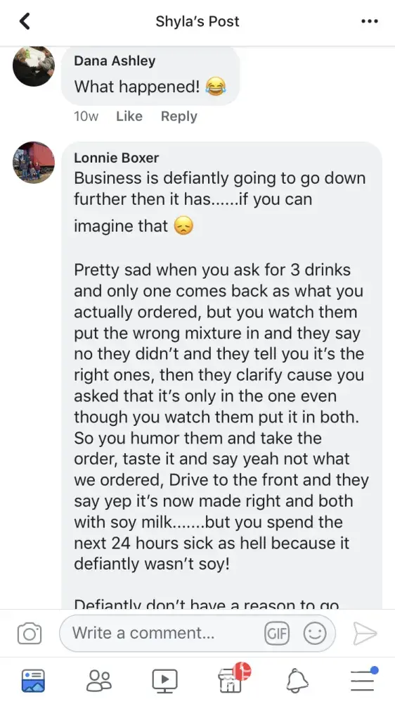 Let's see, slow service, smells like something's on fire and they didn't put milk in my coffee that tasted burnt and got the size wrong!