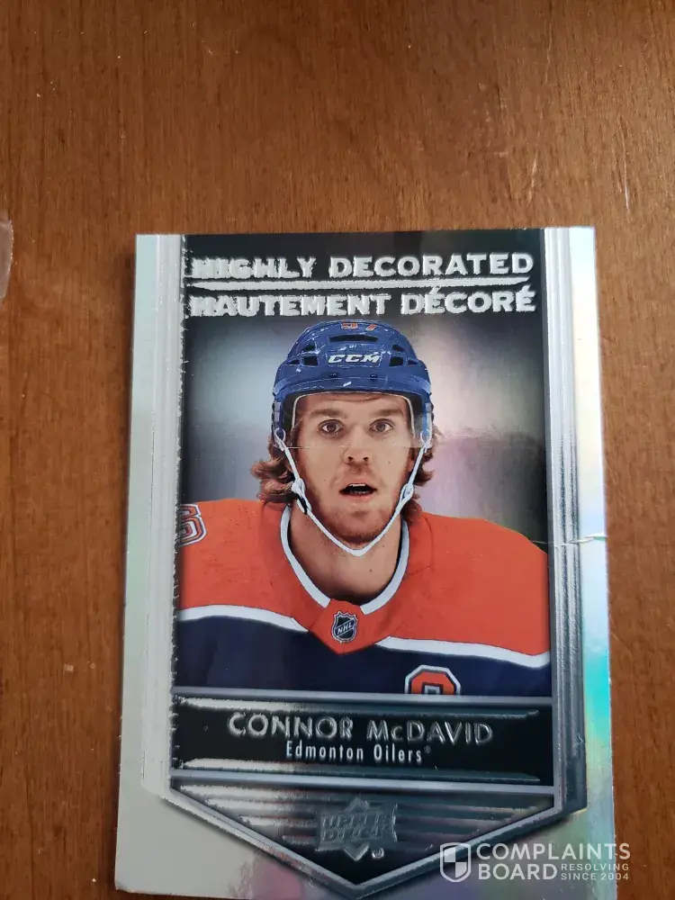 We bought 4 packages of hockey cards. One of the packages only had 1 hockey card in the pack & the card was a smudged Connor McDavid.