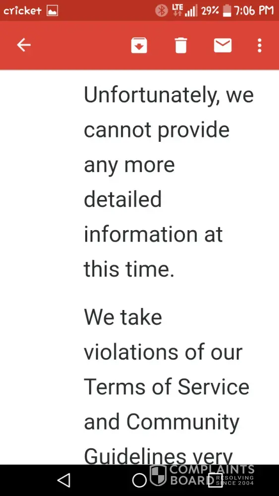 I took a screenshot of the ban msg and sent it support explaining what was going on. Well a few days later, the person named madison that was "helping" me sent me a final msg that's a generic response saying that I am banned and an appeal will not be allowed. If one person on the app dont like you cause of how you look or what you say in your bio and they report you, youre banned for life! How unfair! I'm disgusted I ever gave them my money.