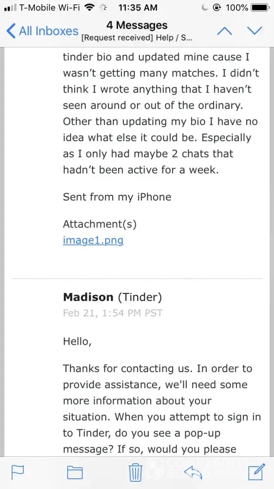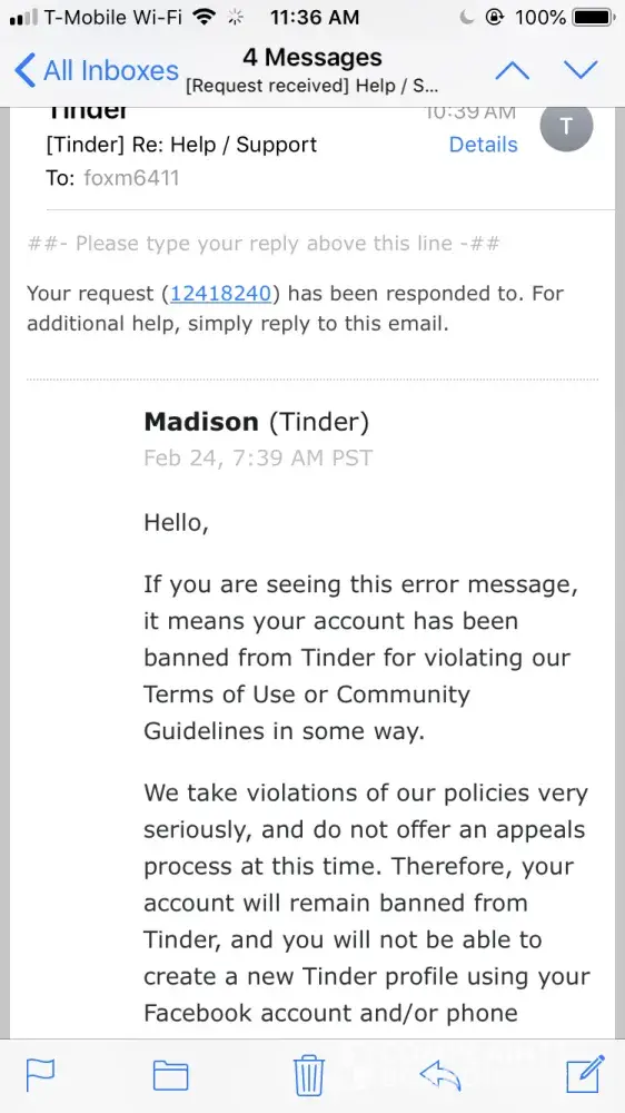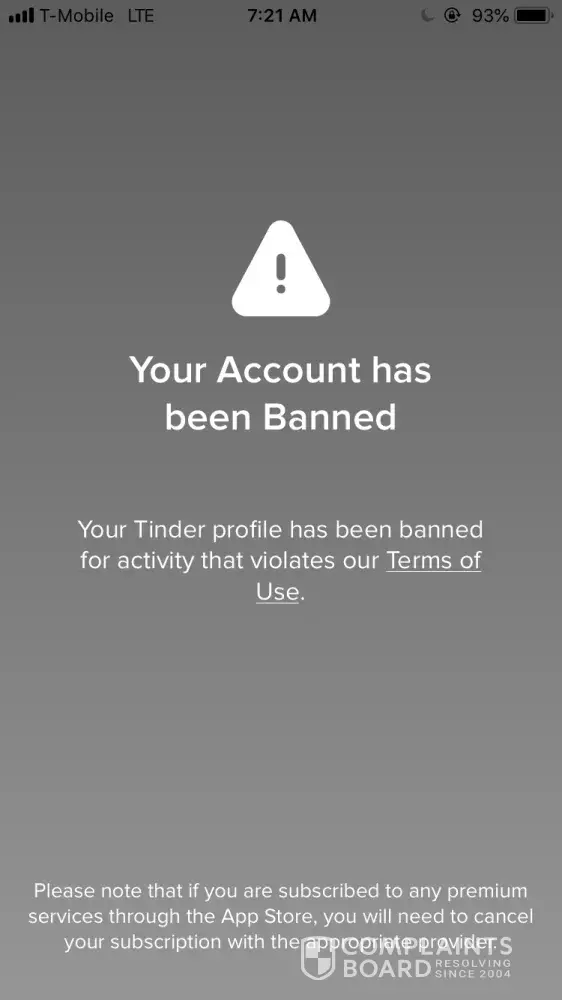 Hi there! My account on tinder was banned for no reason whatsoever. I had my account set up for less than a couple of hours. I had swiped away; did not match with anyone so I didn't even have a single conversation. The next day I went to the app and I couldn't log-on/received an error message; I sent them an e-mail asking why I couldn't log-on and they replied saying I had violated the "terms of use or the community guidelines in some way". I emailed them asking to advise what rule(s) I had violated, they simply said "they take violations seriously …. Unfortunately cannot provide any more detailed information" and I was to re-read all the terms of use (which I did). And they said they "do not offer appeals". I actually took the time and have read through the terms of service and community guidelines and for the life of me cannot find any violation I may have allegedly committed (?). All I want to understand is why the ban, and allegedly which rule(s) I broke. I also did a search online about tinder bans, and found so many complaints about no reason for banning users. I will not use the tinder app ever again (and apparently they will never let me), but I would like for them to provide evidence of my guilt and I would like my name/account cleared. Innocent until proven guilty. I also wonder if users who were banned for no reason can "ban together for a reason" again them …