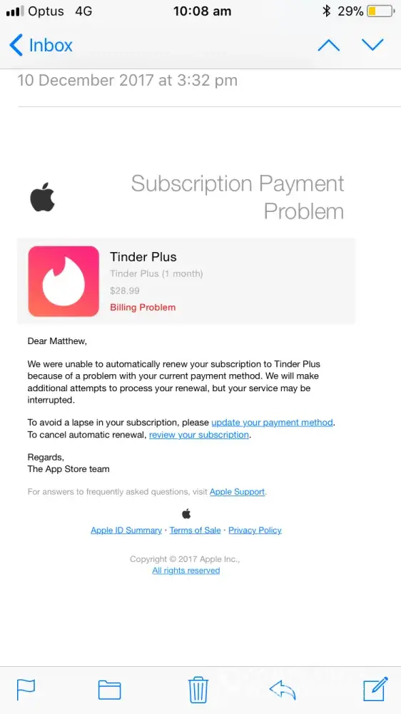 I deleted tinder over a month ago and it's still charging me. I wish to end my subscription. I was under ther impression that I paid for a tinder plus with a one month subscription but apple billing have continued to deduct $28.99 from my account each month. I was not aware I was signing up for a a contract and I'd like to cease further payments for a app I used only the once.
