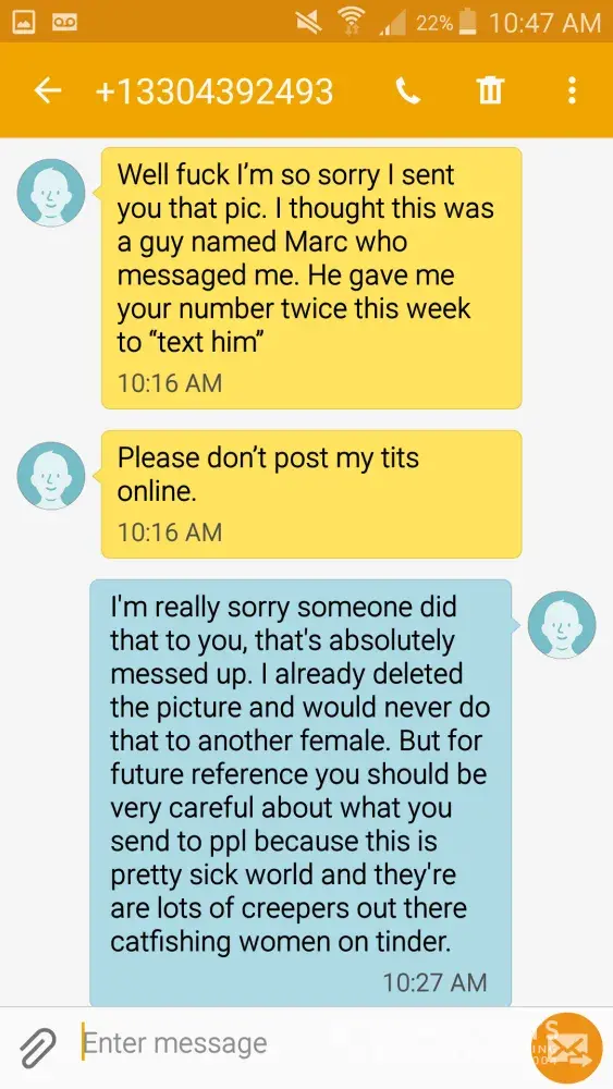 My name is Priscilla Cutlip and I would like to report a person who is using my cell phone number to catfish women. I've received several text messages from random people who send me inappropriate pictures. I do not use tinder nor do I have profile. The person giving out my cell phone number claims to be a man named Marc in the 330 area code. He's repeatedly giving my number out and I'd hate to take legal action against the site.