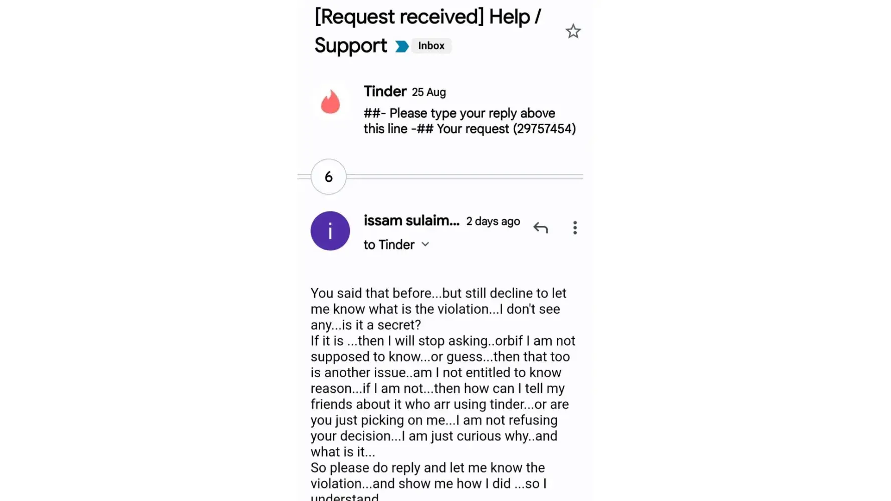 I had Tinder for a week or two and then got kicked off. My account was under review. I had not sent any inappropriate messages, nor had I been rude to anyone. I figured it was because I said I'm transgender first up, as I've had a lot of hate about it. But I let it review me. But that's not the issue.