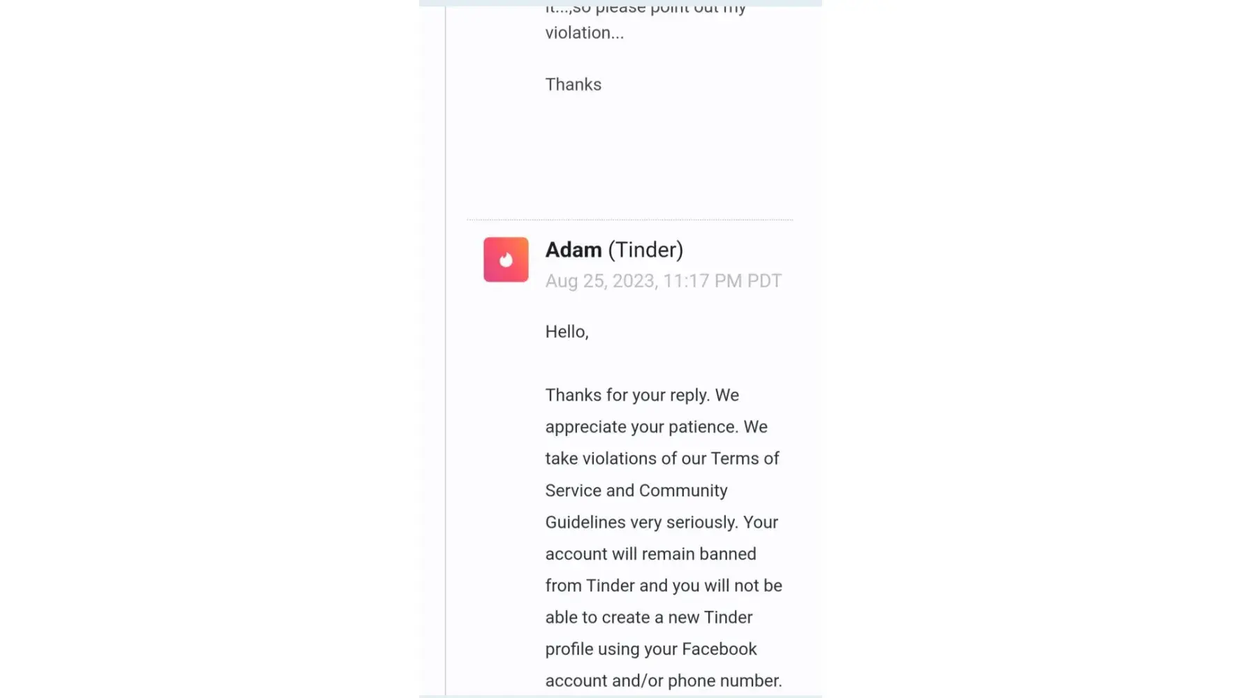 HI my account on tinder was banned for no reason. I got an email saying i violated the terms of service and therefore my account was deleted. I went through all the terms of service and community guidelines and cannot find any violation I may have comiited. I have emailed them several times to ask them to simply tell me what violation I committed but they are refusing to tell me. Please help. I'm not looking for them to unban me or reactivate my account. I simply want them to tell me what rule or rules I broke. Thanks in advance